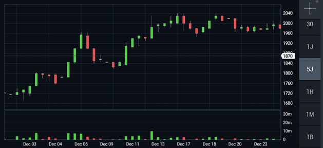 Di bulan Desember, Saham MTDL ini secara garis besar dapat kita lihat mengalami kenaikan yang cukup signifikan diiringi oleh siklus windows dressing yang terjadi, meskipun tak selalu uptrend . MTDL sempat menyentuh titik tertingginya di kisaran 2040 , dan hal ini terjadi 2 kali, walaupun pada akhirnya di penutupan perdagangan desember 2019 turun menyentuh level 1870. Di bulan Desember saham ini sangat menarik bagi investor karna tercatat mengalami kenaikan kurang lebih 7%, sehingga masuk jajaran saham trending yang menarik untuk di beli.