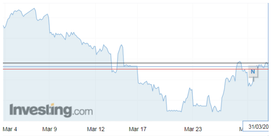 Harga saham Telkom pada awal Maret 2020 mengalami penurunan sebesar 1,34%. Sama seperti saham lainnya, harga saham telkom mengalami penurunan hingga akhir Maret 2020. Namun, pada tanggal 26-31 Maret saham Telkom terus mengalami kenaikan. Pada akhir Maret 2020, saham ini mengalami kenaikan sebesar 0,64% atau setara dengan 20 poin. Berikut grafik Telkom selama Maret 2020