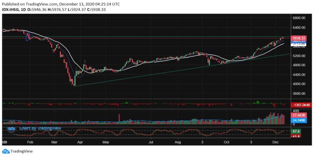 Indeks Harga Saham Gabungan (IHSG) turut mengalami peningkatan 2,20 persen dan berada pada level 5.938,329 dari posisi 5.810,483 pada penutupan pekan sebelumnya. Kemudian data kapitalisasi pasar bursa pekan ini juga ditutup meningkat sebesar 2,25 persen menjadi Rp6.910,151 triliun dari Rp6.758,210 triliun pada pekan yang lalu. Pada pekan ini hanya rata-rata nilai transaksi harian selama sepekan yang mengalami perubahan sebesar 3,24 persen atau menjadi Rp19,042 triliun dari Rp19,680 triliun pada penutupan pekan sebelumnya. Investor asing pada hari ini mencatatkan nilai jual bersih sebesar Rp1,307 triliun, sedangkan sepanjang tahun 2020 mencatatkan jual bersih sebesar Rp46,195 triliun.