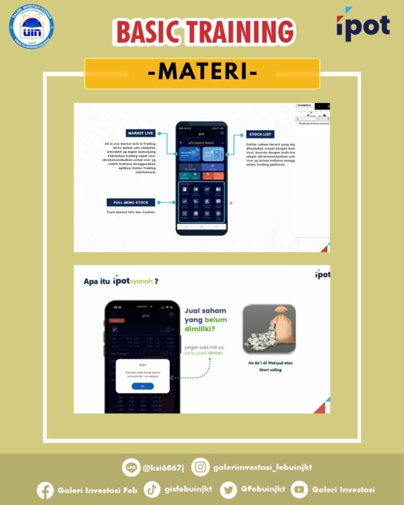 Kamis, 7 Januari 2021, Divisi Eksternal Galeri Investasi Syariah Fakultas Ekonomi dan Bisnis UIN Jakarta menyelenggarakan kajian internal pertama, yaitu Basic Training Opening Account dengan tema “First Step of Investing with Indopremier and Why Choosing IPOT”. Kajian internal ini dilaksanakan selama satu hari melalui media Zoom Cloud Meeting.