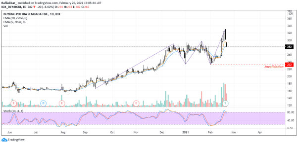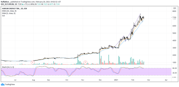 Secara teknikal, pergerakan HRUM masih menunjukkan tanda Uptrend yang masih terjaga dan belum memiliki tanda tanda pembentukan Lower Low. Selain itu, HRUM masih terjaga di level EMA 5 dan EMA 10 yang tentunya menujukkan arah trend yang masih sehat selama masih belum menembus level EMA tersebut. Ditambah lagi dengan stochastic yang masih bertahan di level 80 dan belum menunjukkan tanda-tanda adanya pembalikan arah maupun pembalikan trend.