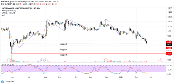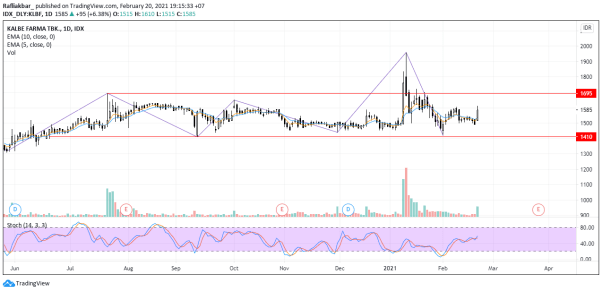 Secara teknikal, KLBF pun tengah mengalami sidewys yang cukup panjang sejak Agustus 2020 hingga Februari 2021. Di tengah kondisi distribusi vaksin yang ingin disalurkan di Indonesia justru tidak cukup mampu memberikan stimulus untuk mendongkrak harga KLBF. Akan tetapi di sesi perdangangan 19 Februari 2021 saham KLBF mendongkrak naik disertai volume yang tinggi sehingga mengindikasikan adanya potensi kenaikan harga dengan target terdekat pada 1695.