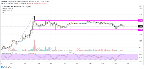 Secara teknikal, EKAD tengah mengalami sideways setelah mengalami Uptrend hingga bulan Juli 2020. Hal tersebut dibuktikan dengan range harga EKAD yang cenderung berada pada kisaran 1170 – 1310. Sementara itu, stochastic yang sudah berada di area overbought dan cenderung mengindikasikan EKAD akan mengalami koreksi menuju area support. Di tengah kondisi yang sideways tersebut belum membuat market tertarik karena belum ditunjukkan oleh volume yang meningkat.