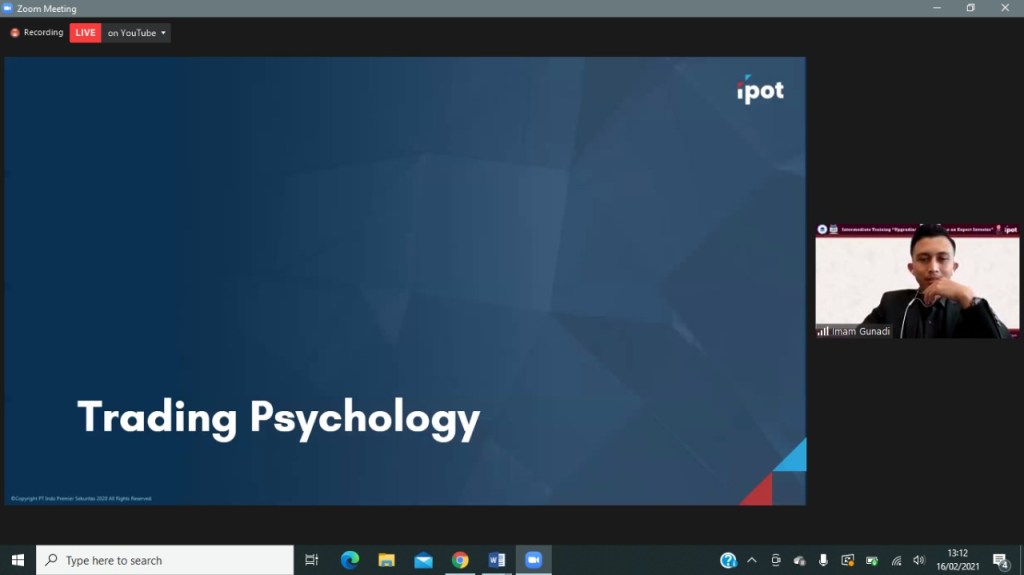 Intermediate Training dilaksanakan selama tiga hari dengan tiga topik, yaitu Senin (15/02/21) membahas fundamental lanjutan dan bedah laporan keuangan oleh RR. Tini Anggraeni, ST. M.Si, Selasa (16/02/21) membahas teknikal lanjutan oleh pihak Indo Premier Sekuritas, dan Rabu (17/02/21) praktik trading view dan live trading bersama Linda Lee.