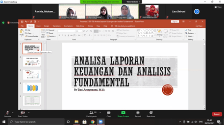 Berikutnya ada pemaparan materi yang disampaikan oleh Ibu RR. Tini Anggraeni, ST,. M.Si,.yang di moderator oleh Shela Asfira Komalasari. Pada materi ini, pemateri membawakan dua indikator pembelajaran meliputi “Analisa Laporan Keuangan dan Rasio Keuangan” yang membahas mengenai metode analisis perusahaan yang didasarkan pada faktor-faktor fundamental ekonomi suatu perusahaan, analisis fundamental yang mengandalkan keuntungan baik dalam jangka panjang maupun pendek, serta materi mengenai analisa rasio keuangan mulai dari rasio likuiditas, solvabiilitas, profitabilitas, hingga rasio pasar, dan yang terakhir ada tips mengenai tolak ukur pemilihan saham dari kapan saham itu harus dibeli dan dijual. Lalu setelah penyampaian materi selesai, moderator membuka sesi pertanyaan untuk para peserta membership yang ingin bertanya mengenai pemaparan materi yang telah disampaikan oleh pemateri.