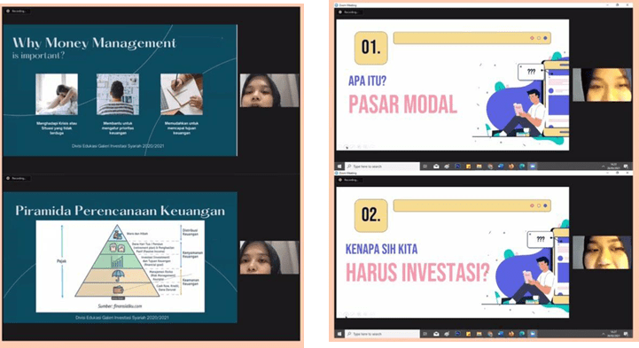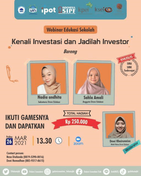 Edukasi SMA dinarasumberi oleh Sahla Amali Syuaib dan Nadia Andhita selaku perwakilan dari Divisi Edukasi, dan dimoderatori oleh saudari Tania Eka Maharani. Pada webinar tersebut pemateri membawakan materi mengenai Time Management dan Pengenalan Pasar Modal kepada para peserta. Tak lupa kami juga menjelaskan bagaimana cara bertransaksi melalui aplikasi dari Sekuritas IPOT yang dipandu oleh Ahmad Faris Mu’tashin.