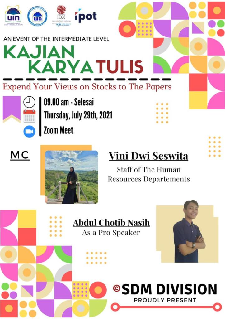 Pada hari Kamis , 29 Juli 2021, Divisi SDM Galeri Investasi Syariah FEB UIN Jakarta menyelenggarakan kajian dengan tema “Expend Your Views on Stocks to The Papers”. Tujuan diadakannya kajian dan pelatihan ini, diharapkan dapat membantu pengurus Galeri Investasi Syariah (GIS) dalam mempersiapkan lomba dan diharapkan dapat melatih pengembangan keterampilan dalam menganalisis saham untuk kemudian dapat dituangkan kedalam paper.