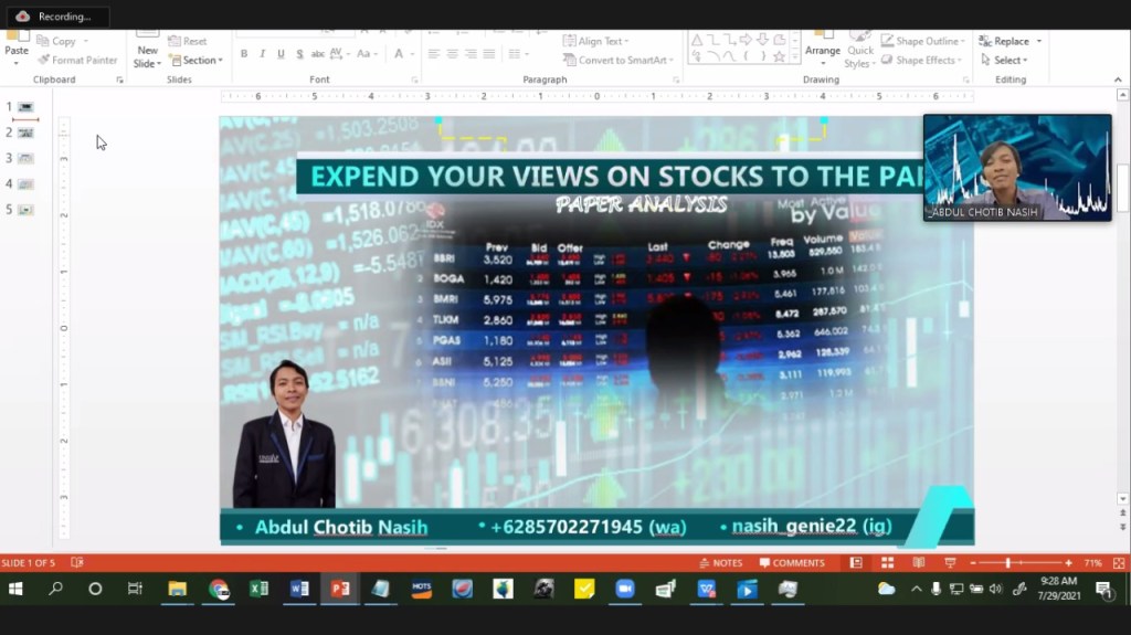 Berikutnya ada pemaparan materi yang disampaikan oleh Abdul Chotib Nasih selaku Pemateri yang di moderatori oleh Muhammad Iqbal Maurizza. Pemateri membawakan materi dengan tema “Expend Your Views on Stock to The Paper” yang membahas penjelasan umum stockcase competition, sistematika penyusunan stockcase competition, cara menyusun profile emiten, tips menuliskan analisa fundamental dan teknikal ke dalam paper, cara menganalisa dan menuliskan rekomendasi untuk (buy, shell, and hold) ke dalam paper.