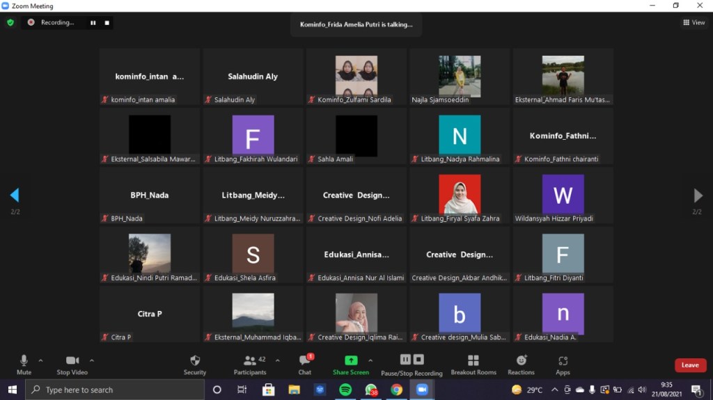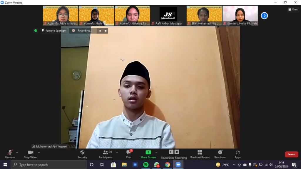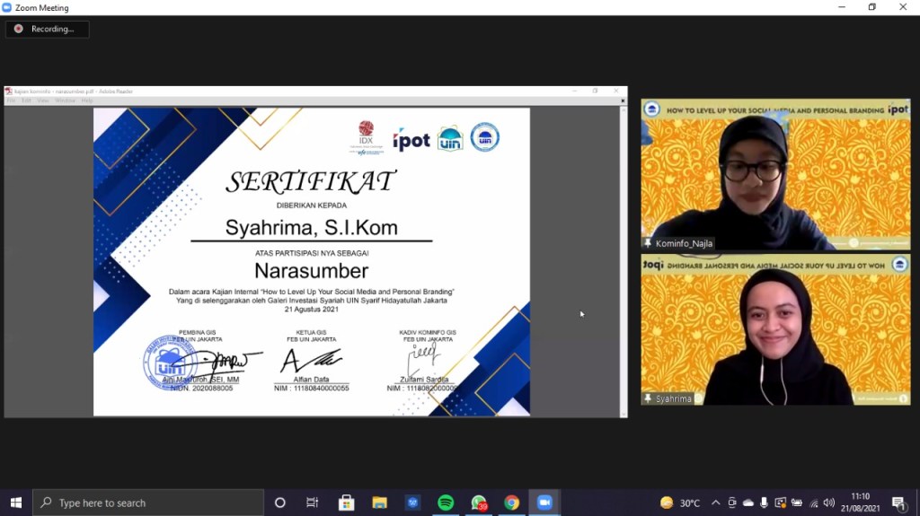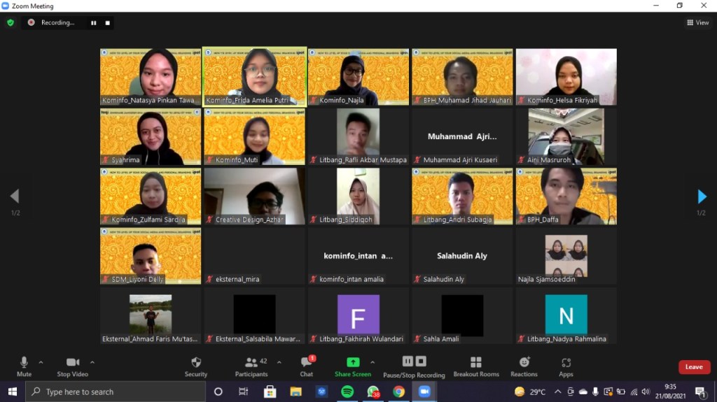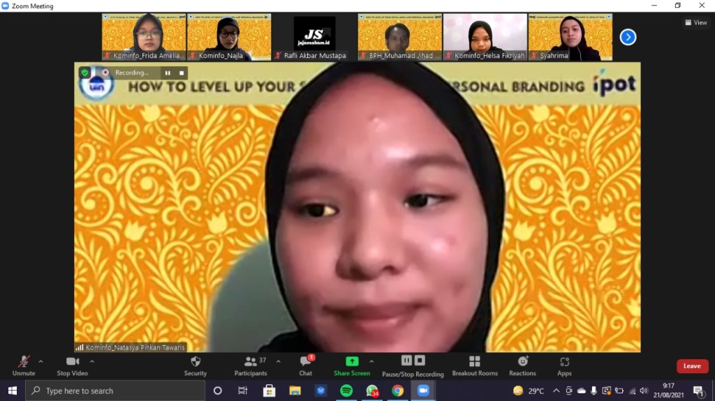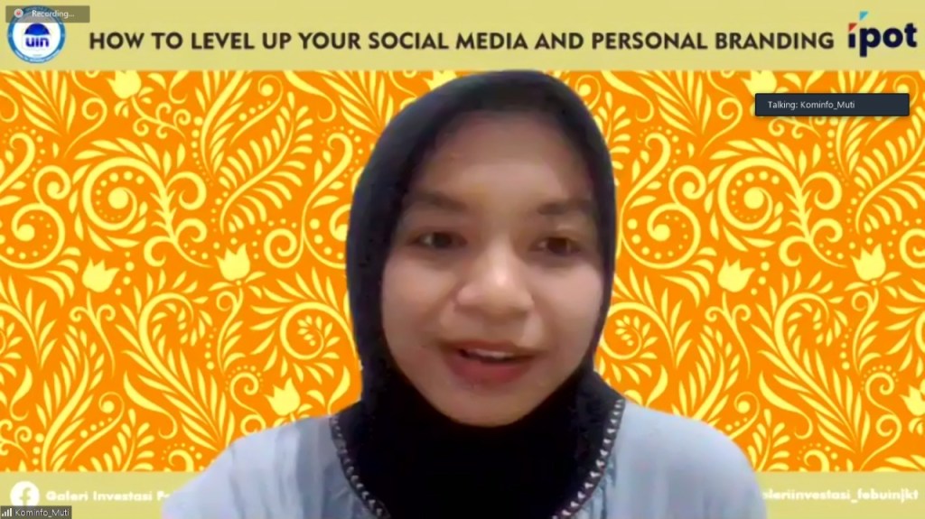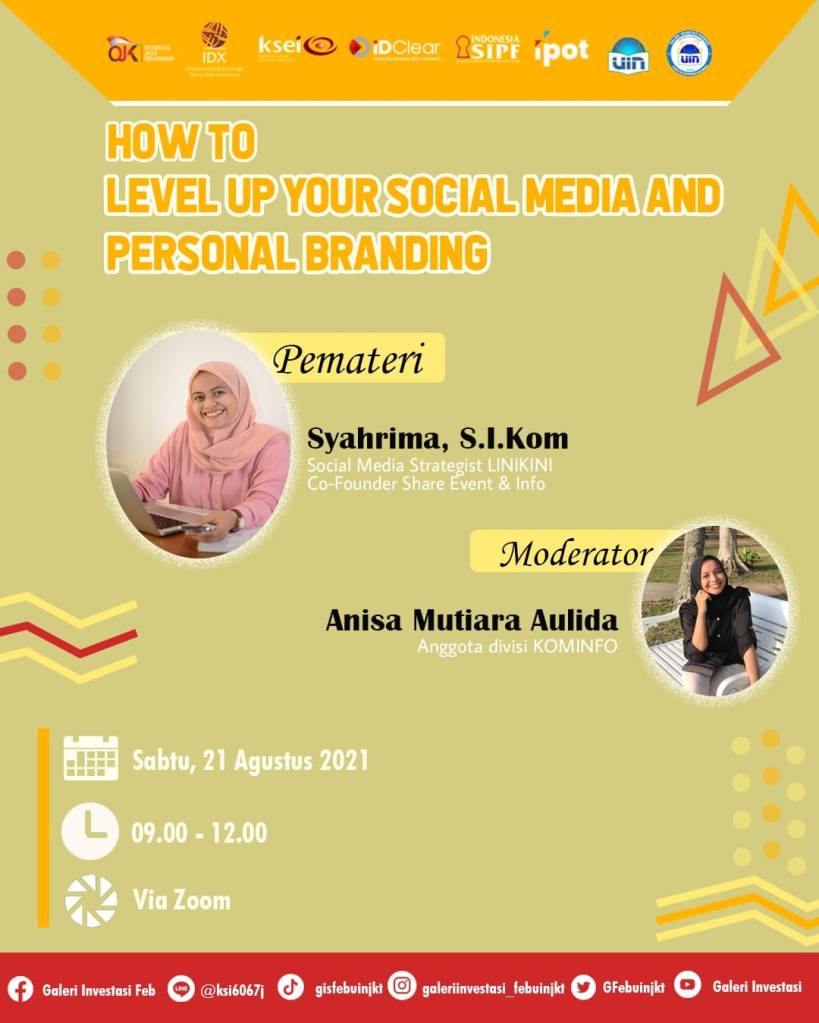 Sabtu, 21 Agustus 2021, Divisi Komunikasi dan Informasi Galeri Investasi Syariah Jakarta menyelenggarakan Kajian Internal dengan tema “How to Level Up Your Social Media and Personal Branding” yang dihadiri oleh pengurus dan anggota GIS. Acara dimulai pukul 09.15 – 11.30 WIB melalui platform Zoom Meeting. Pemateri Kajian Internal Divisi Kominfo adalah Kak Syahrima, S.I.Kom selaku Social Media Strategist di LINIKINI.