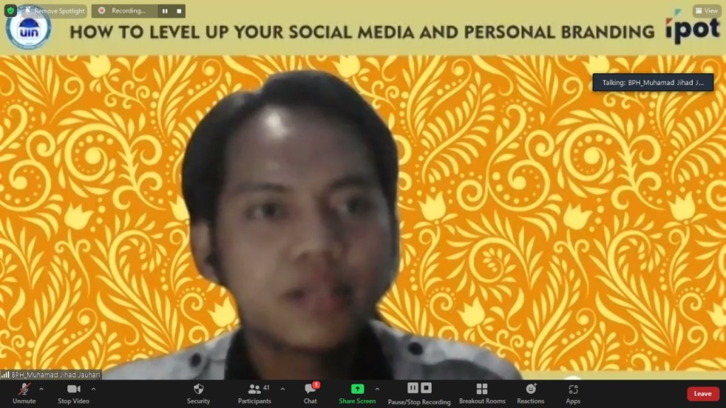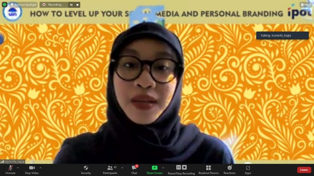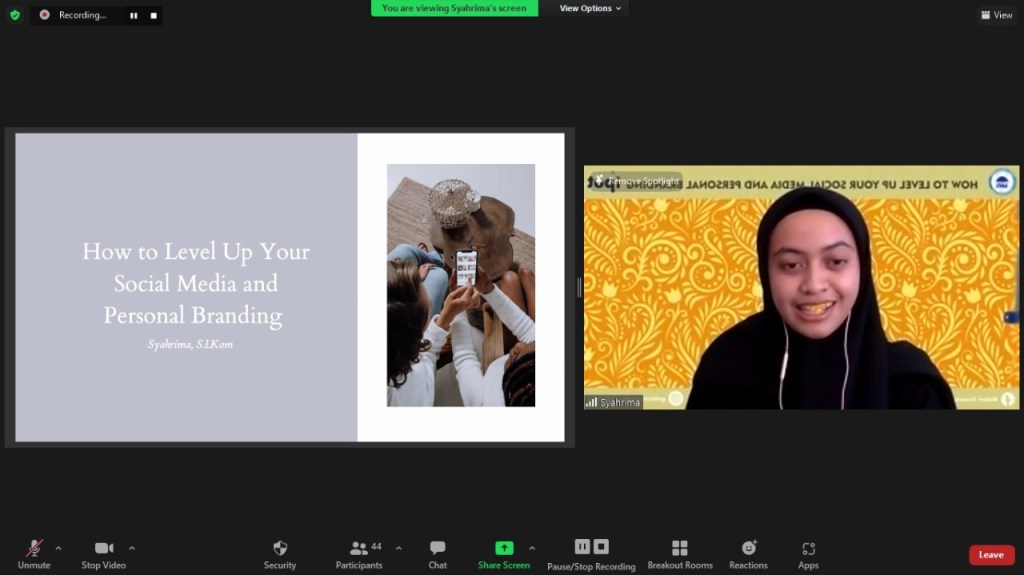 Kak Syahrima, S.I.Kom mulai menyampaikan materi yang dimoderatori oleh Anisa Mutiara Aulida. Materi yang disampaikan adalah perkenalan personal branding, social media, do and don’ts dalam meningkatkan performa social media dan melakukan personal branding. Kak Syahrima pun memberikan saran kepada peserta untuk membuat linked.in sedini mungkin karena media sosial tersebut dapat membantu kita dalam mencari lowongan pekerjaan dan pastinya dapat menambah relasi. Selain itu, Kak Syahrima juga mengingatkan kita untuk berhati-hati saat memposting sesuatu di internet karena jejak digital begitu seram. Artinya, apa yang kita posting di social media bisa menjadi boomerang untuk kita sendiri.