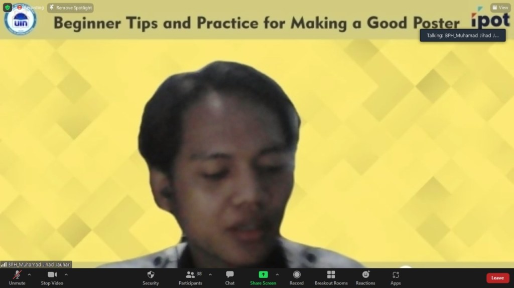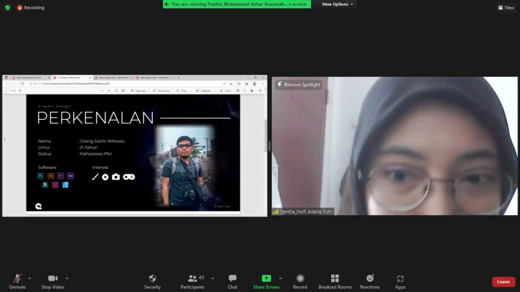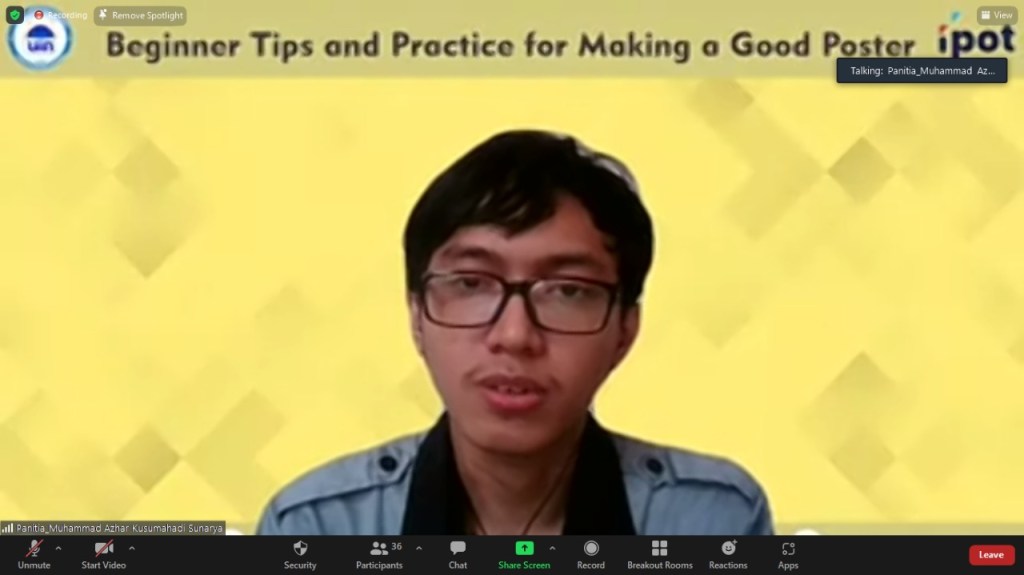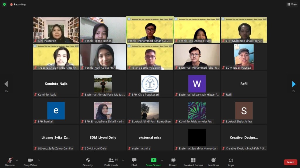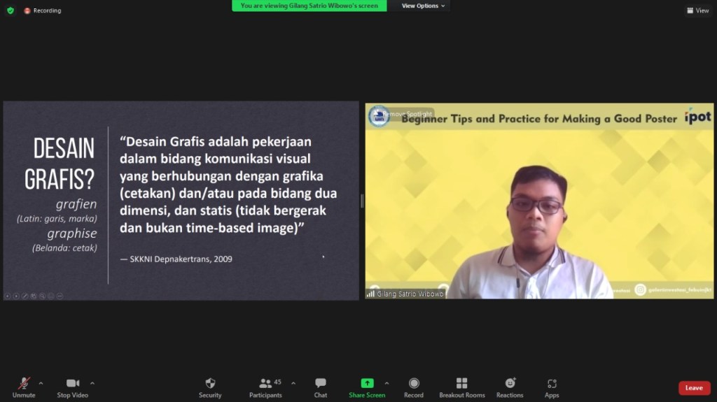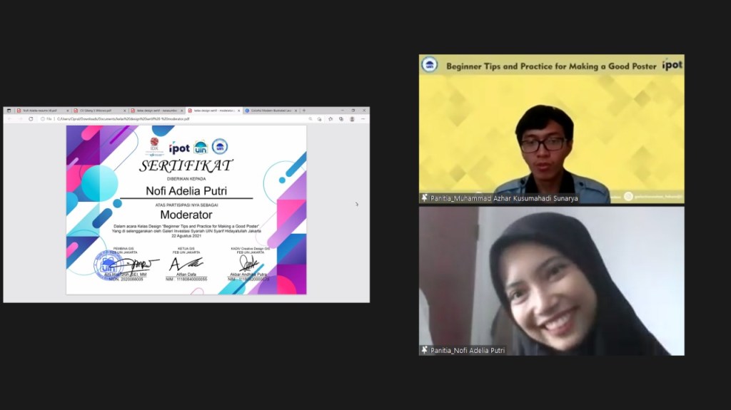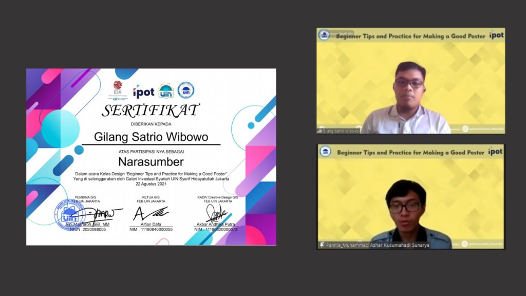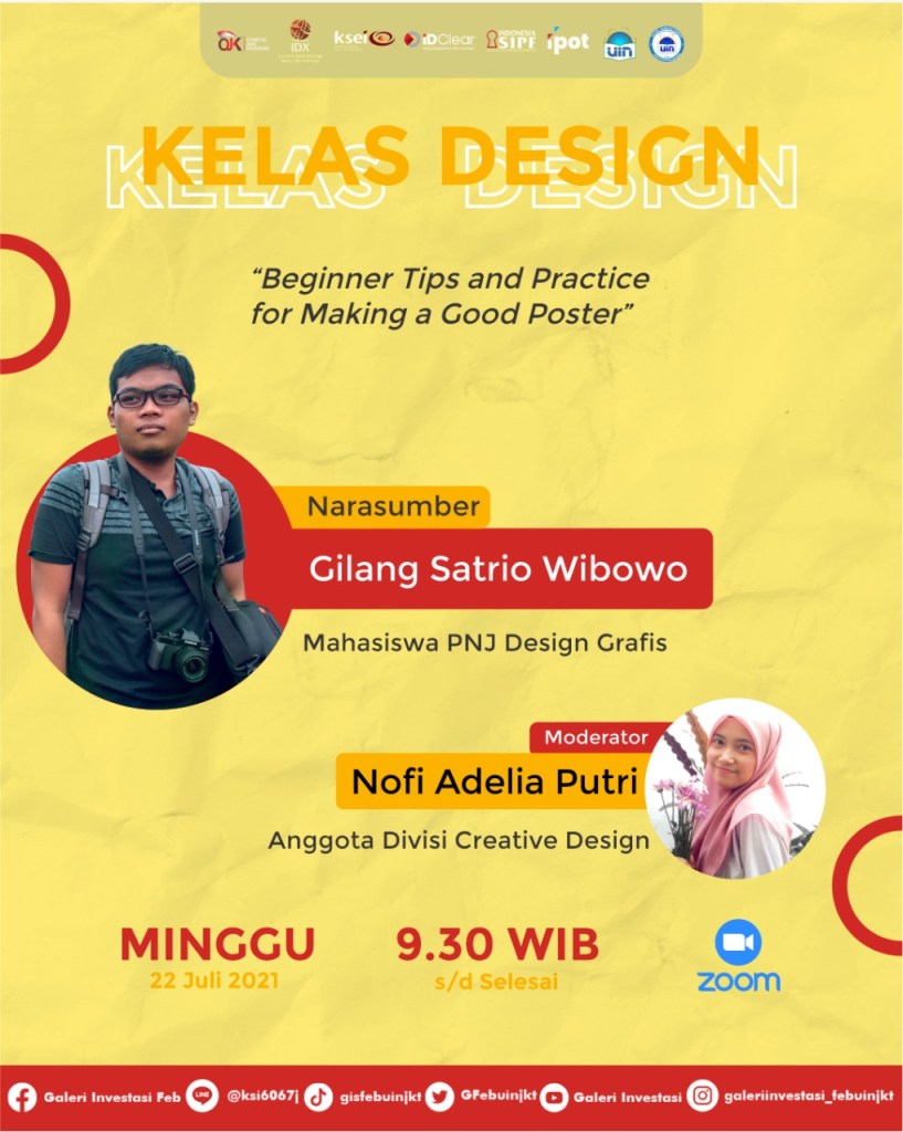 Minggu, 22 Agustus 2021, Divisi Creative and Design GIS FEB UIN Syarif Hidayatullah Jakarta menyelenggarakan Kelas Design dengan tema “Beginner Tips and Practice for Making a Good Poster” yang dihadiri oleh pengurus dan anggot GIS. Acara dimulai pukul 09.45 – 11.45 WIB memalui platform Zoom Meeting. Pemateri hari ini adalah Gilang Satrio Wibowo dari Design Grafis Politeknik Negeri Jakarta.