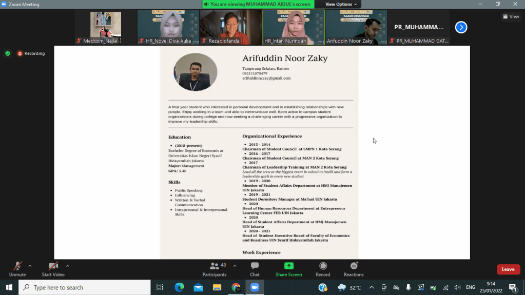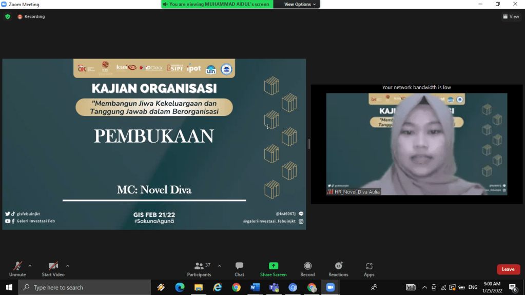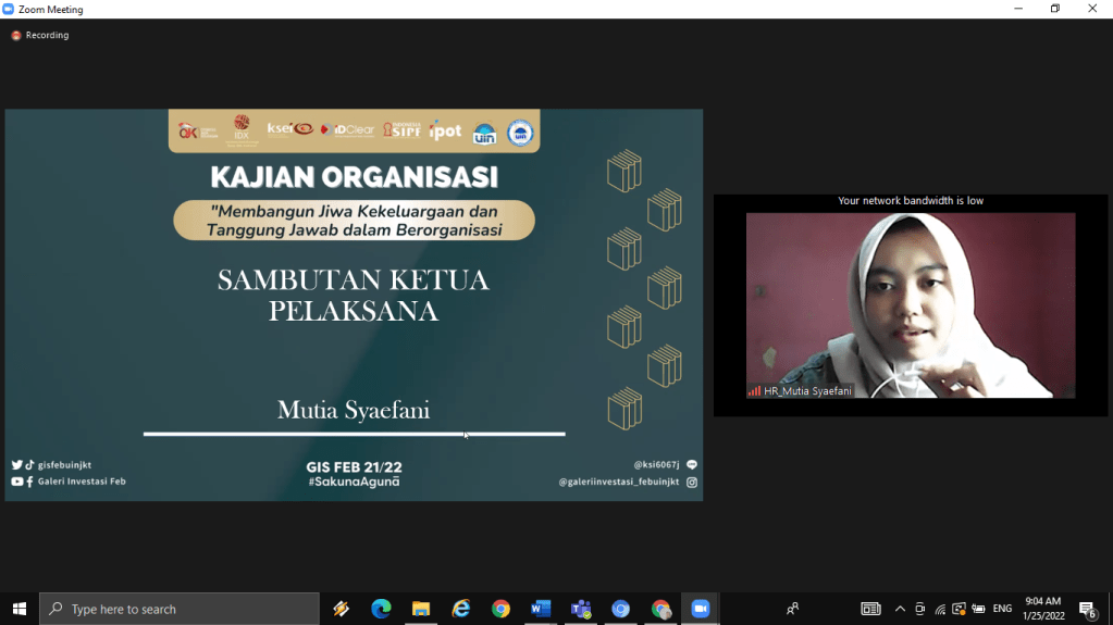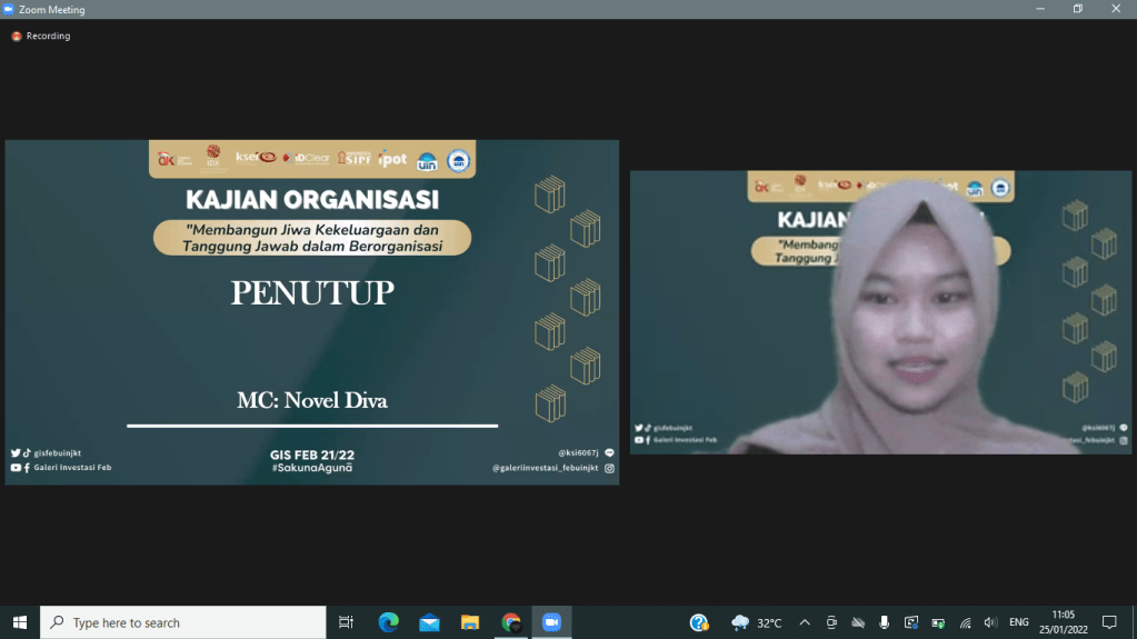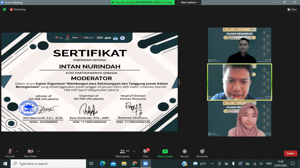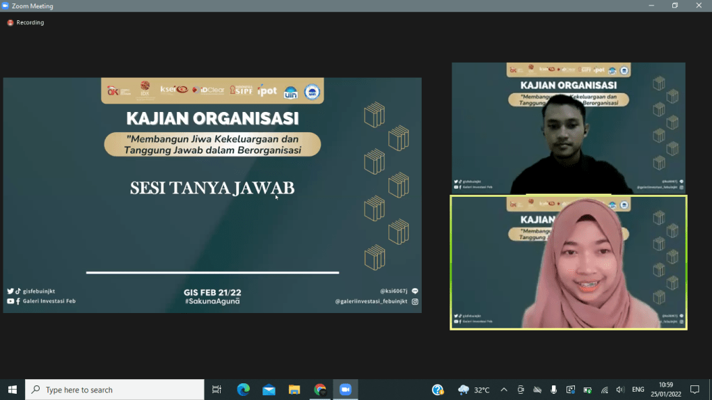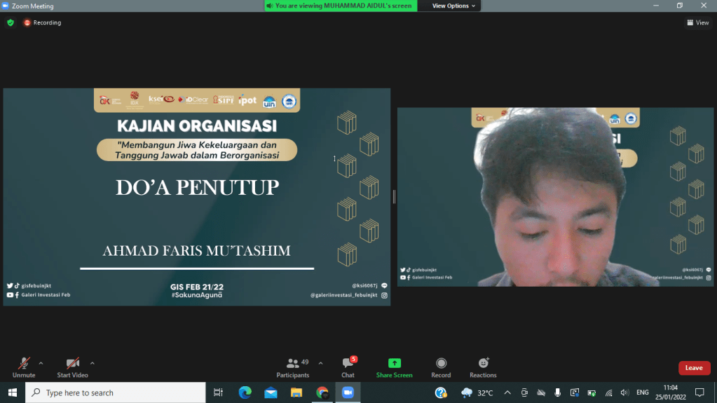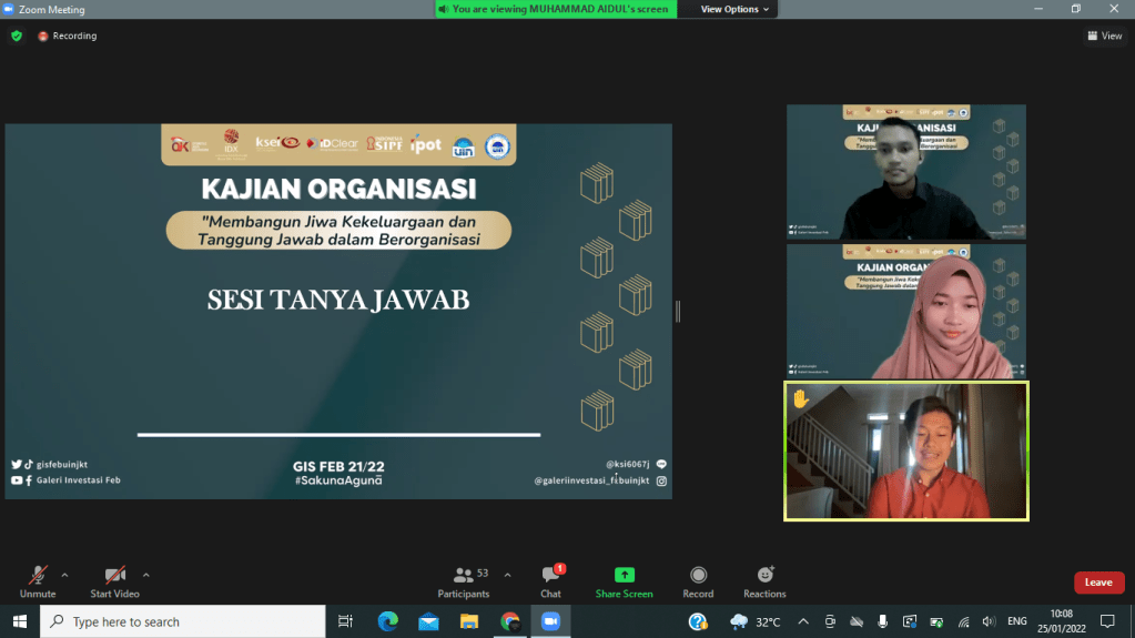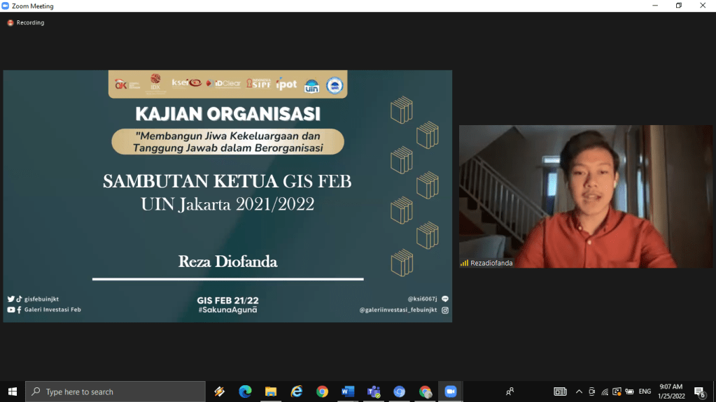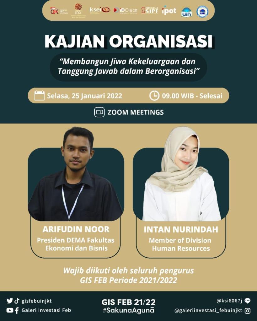 Selasa, 25 Januari 2022 kemarin Divisi Human Resources Galeri Investasi Syariah FEB UIN Jakarta telah menyelenggarakan kajian internal pertama yaitu Kajian Organisasi dengan tema “Membangun Jiwa Kekeluargaan dan Tanggung Jawab dalam Berorganisasi”. Kajian ini diselenggarakan secara online melalui media virtual meeting zoom. Pemateri kajian ini adalah Presiden DEMA Fakultas Ekonomi dan Bisnis Arifudin Noor Zaky.