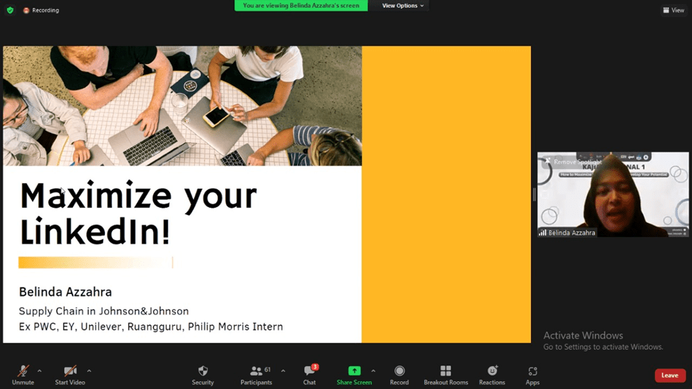 Pemaparan materi dibawakan oleh Belinda Azzahra. Banyak sekali ilmu yang dapat diambil dari penyampaian materi kak Belinda. Pembahasan materi ini membahas tentang aplikasi LinkedIn yaitu beberapa tips untuk membuat akun LinkedIn yang baik dan benar serta materi tentang mencari potensi diri. Setelah pemaparan materi dari Kak Belinda, acara dilanjutkan dengan sesi tanya jawab.