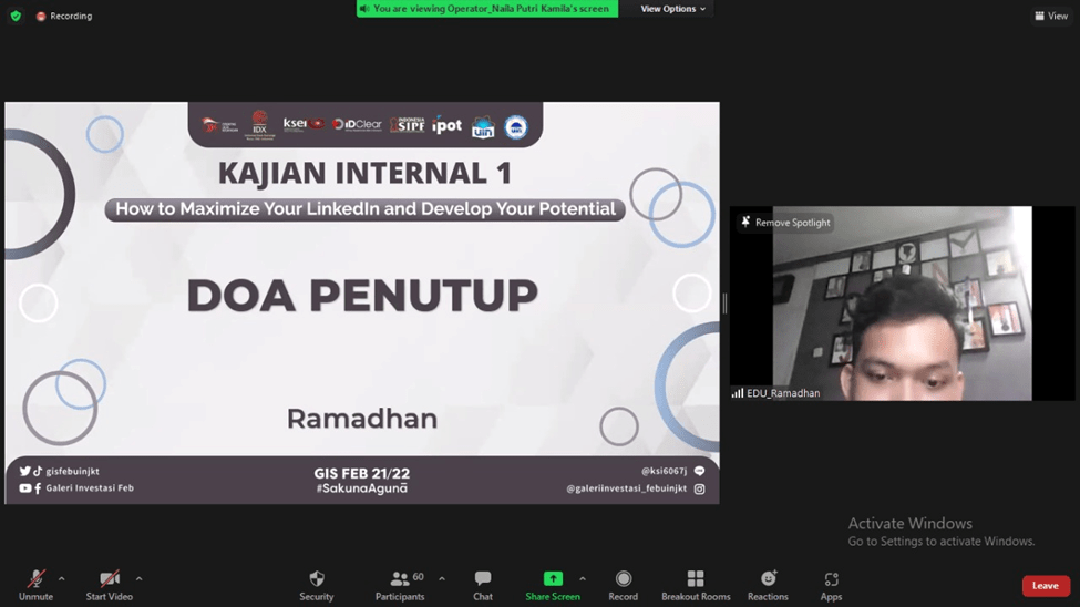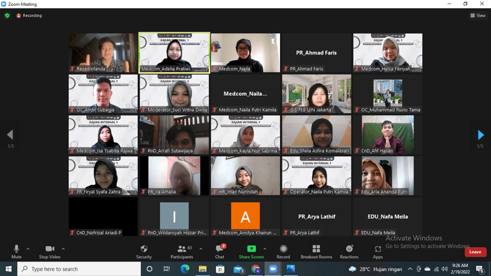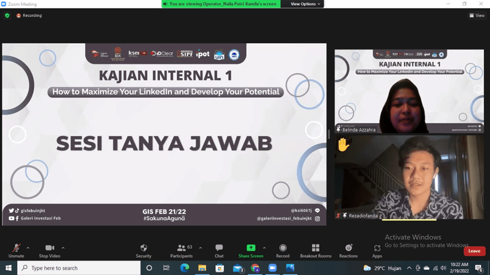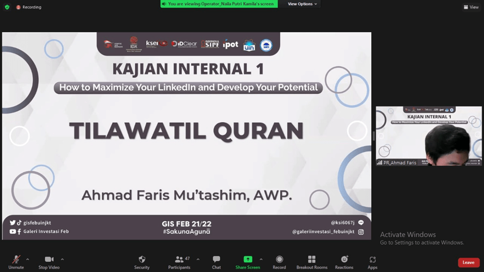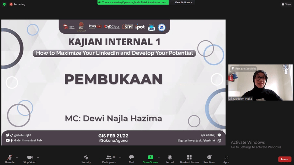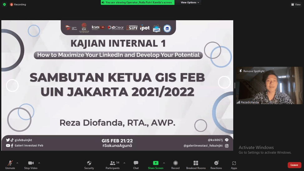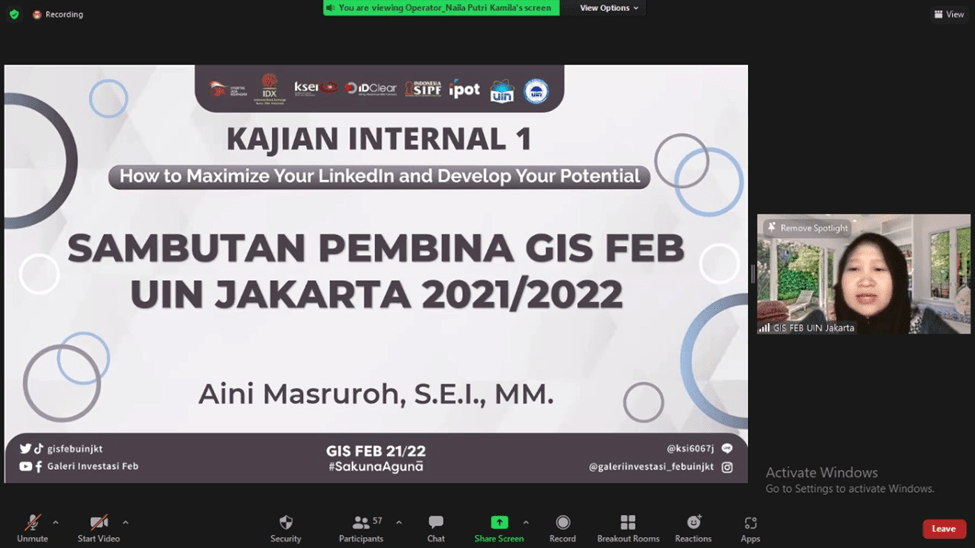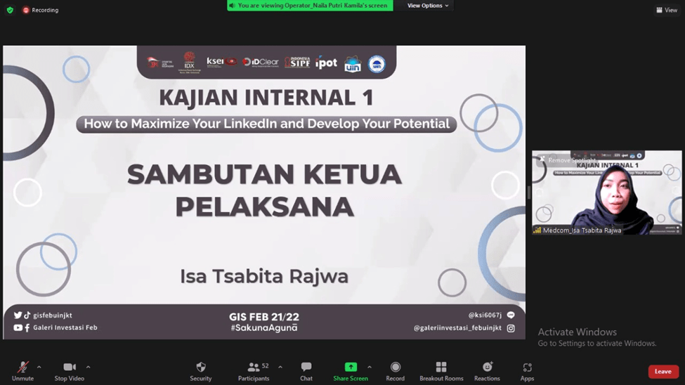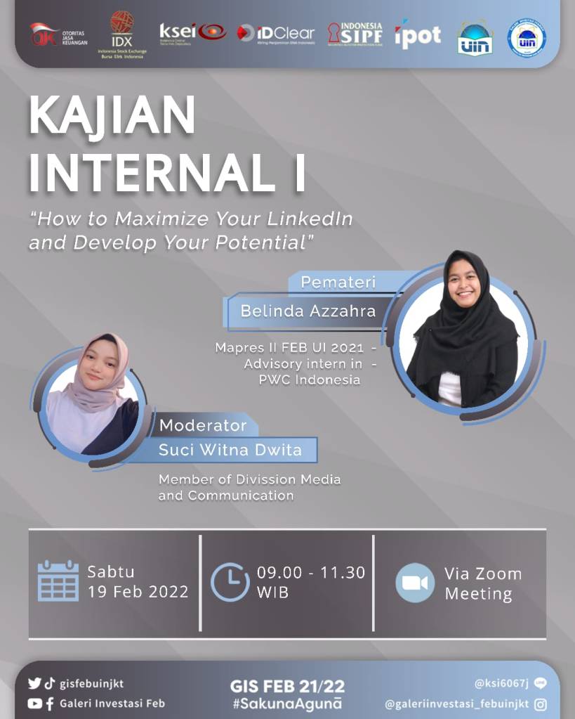 Pada pertengahan bulan Februari tepatnya Sabtu, 19 Februari 2022 kemarin, Divisi Media and Communication Galeri Investasi Syariah FEB UIN Jakarta telah mengadakan Kajian Internal I dengan tema “How to Maximize Your LinkedIn and Develop Your Potential”. Kajian ini diselenggarakan secara online melalui media virtual meeting zoom. Pemateri kajian ini adalah Belinda Azzahra.