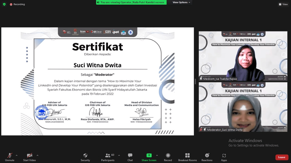 Setelah sesi tanya jawab antara peserta dengan pemateri dilanjutkan dengan pemberian sertifikat digital kepada pemateri oleh Saudara Reza Diofanda selaku Ketua Galeri Investasi Syariah dan juga pemberian sertifikat digital kepada moderator oleh Isa Tsabita Rajwa selaku Ketua Pelaksana Kajian.