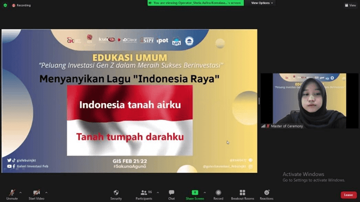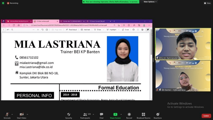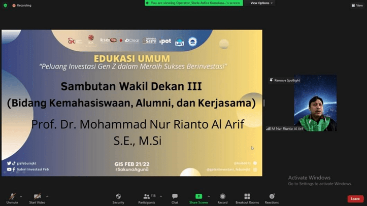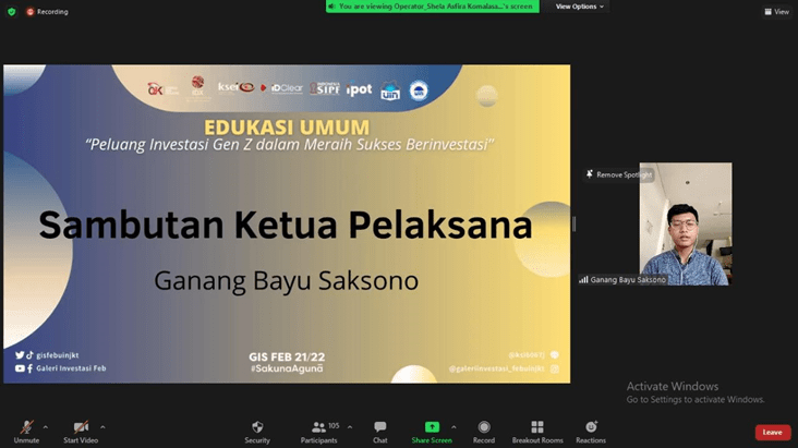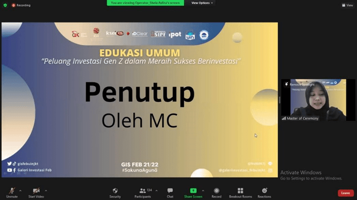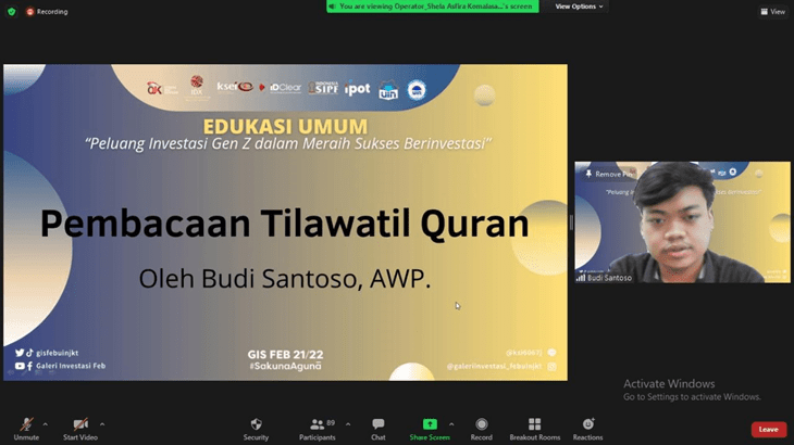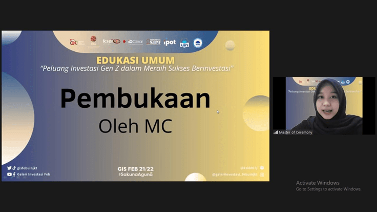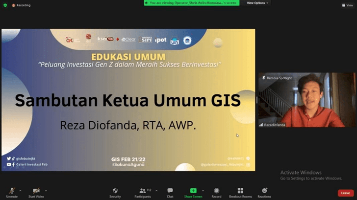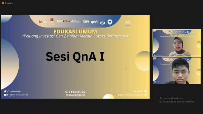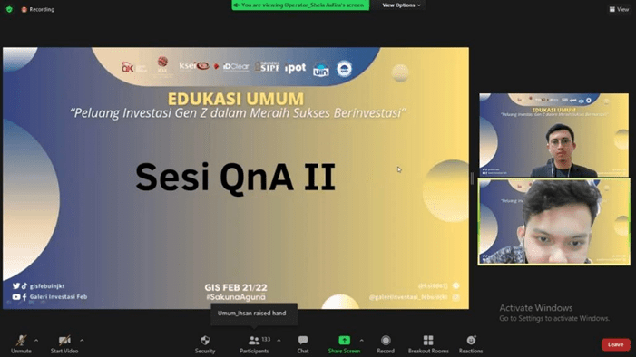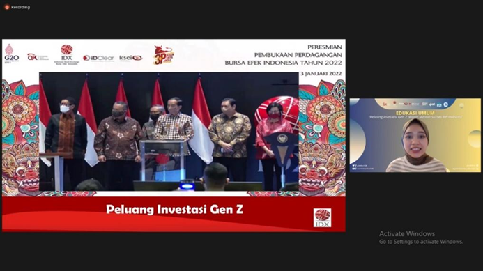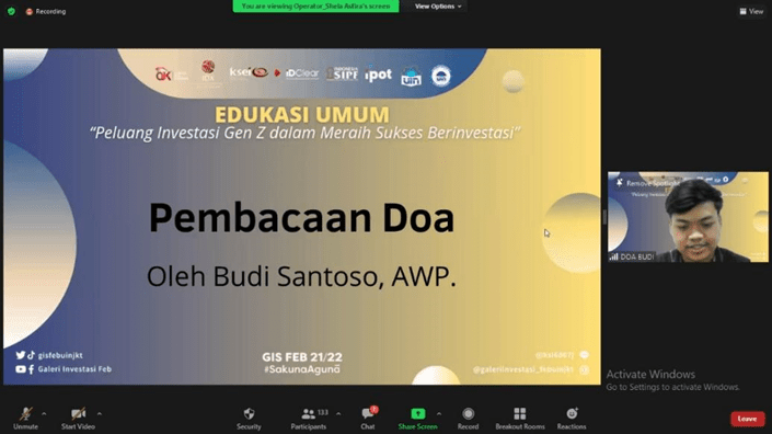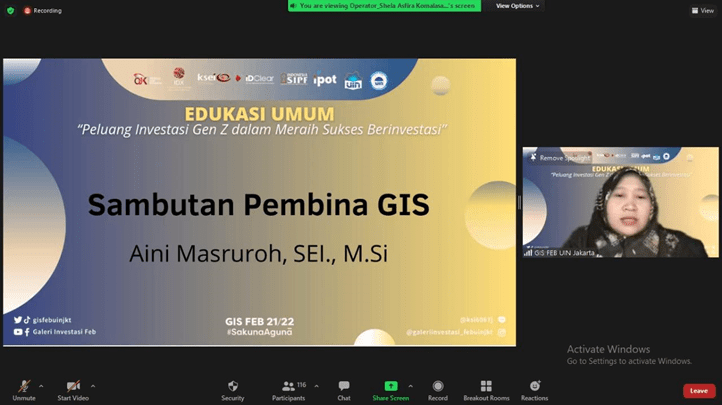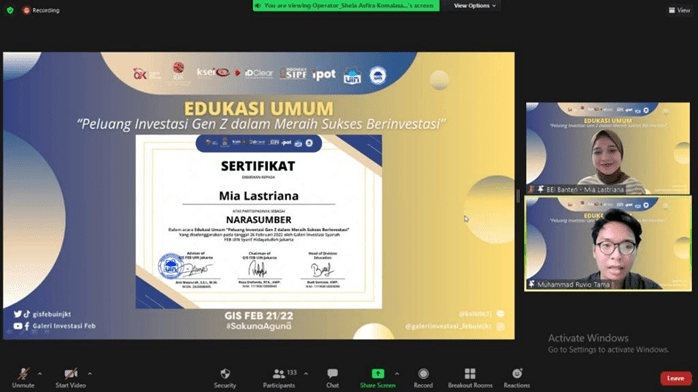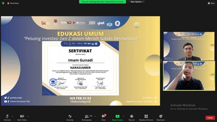 Pada akhir bulan Februari tepatnya Sabtu, 26 Februari 2022 kemarin, Divisi Education Galeri Investasi Syariah FEB UIN Jakarta telah mengadakan EDUKASI UMUM dengan tema “Peluang Investasi Gen Z dalam Meraih Sukses Berinvestasi”. Webinar ini diselenggarakan secara online melalui media virtual meeting zoom. Divisi Education mengundang Investment Specialist Indopremier Sekuritas, yaitu Bapak Imam Gunadi dan Trainer at Bursa Efek Indonesia (BEI) Kantor Perwakilan Banten, yaitu Ibu Mia Lastriana.