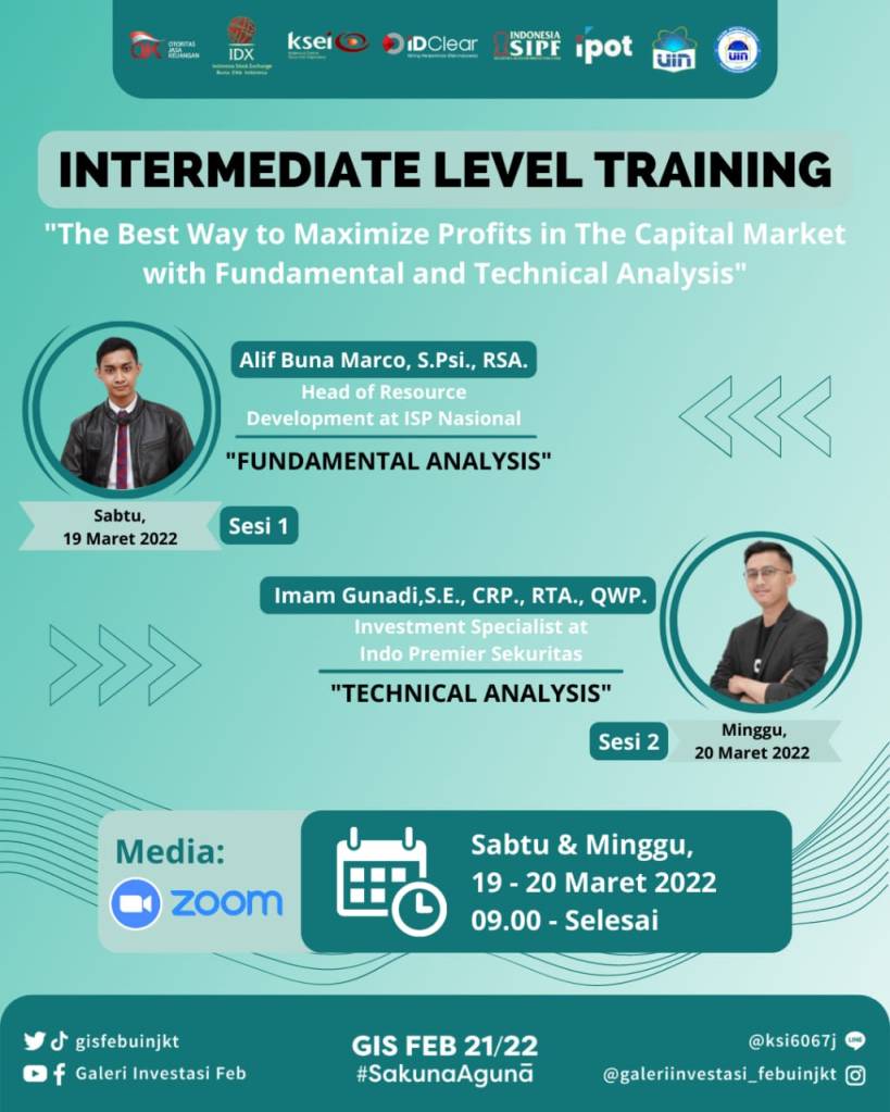 Sabtu & Minggu, 19 – 20 Maret 2022, Divisi Reseacrh and Development Galeri Investasi Syariah FEB UIN Jakarta telah menyelenggarakan Intemediate Level Training dengan Tema “The Best Way To Maximize Profits in The Capital Market With Fundamental & Technical Analysis”. Training ini dilaksanakan selama dua hari dan dilaksanakan secara online melalui media virtual zoom meeting. Terdapat dua pemateri pada training kali ini yaitu Alif Buna Marco, S.Psi., RSA. dan Imam Gunadi, S.E., CRP., RTA., QWP.