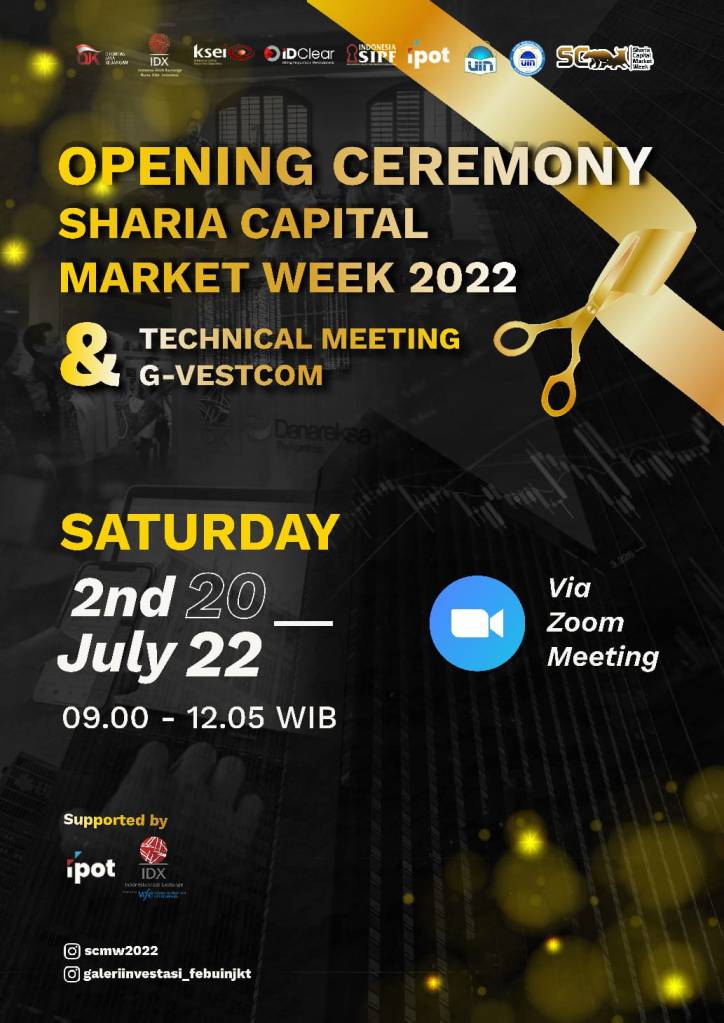 Pada Sabtu, 2 Juli 2022, Sharia Capital Market Week 2022 (SCMW) resmi dibuka. SCMW merupakan program kerja besar tahunan Galeri Investasi Syariah FEB UIN Syarif Hidayatullah Jakarta sebagai sarana untuk memperkenalkan dan meningkatkan pemahaman tentang pasar modal syariah di kalangan SMA, mahasiswa, dan masyarakat umum. Selain itu, SCMW merupakan bentuk nyata atas kepedulian GIS FEB UIN Syarif Hidayatullah Jakarta dalam memajukan pasar modal syariah di Indonesia. Tema kegiatan kami pada tahun ini adalah “Achieve Your Dream Through Sharia Capital Market by Improving Your Knowledge”. SCMW 2022 terdiri dari lima rangkaian acara utama yaitu G-VESTCOM, Certification Talk, Sharia Capital Market School (SCMS), School of Investment dan Company Visit.