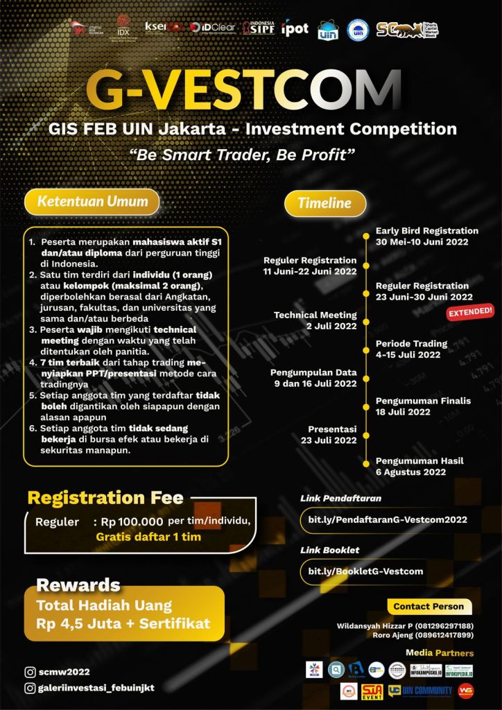 G-Vestcom ini sendiri adalah lomba investasi yang terdiri dari 2 tahap, yang pertama adalah tahap trading pada tanggal 4-15 Juli 2022 dan tahap presentasi pada tanggal 23 Juli 2022. Pada tanggal 30 Mei 2022, Galeri Investasi Syariah FEB UIN Syarif Hidayatullah Jakarta mulai membuka open registrasi untuk tahap early bird lomba G-Vestcom (GIS FEB UIN Syarif Hidayatullah Jakarta – Investment Competition). Tahap registrasi untuk G-Vestcom ini berlangsung sampai dengan tanggal 10 Juni 2022 dengan biaya pendaftaran Rp 75.000 per tim/individu. Kemudian, G-Vestcom membuka dua tahap pendaftaran lagi, yaitu tahap reguler dan reguler extended. Tahap reguler dibuka dari tanggal 11 – 22 Juni 2022, sedangkan tahap reguler extended dibuka pada tanggal 23 – 30 Juni 2022.