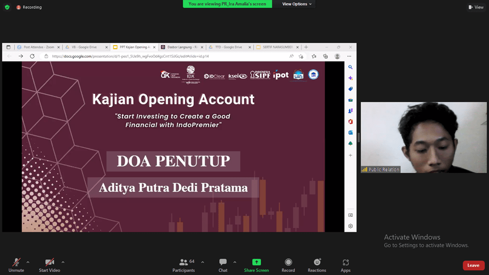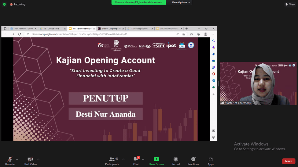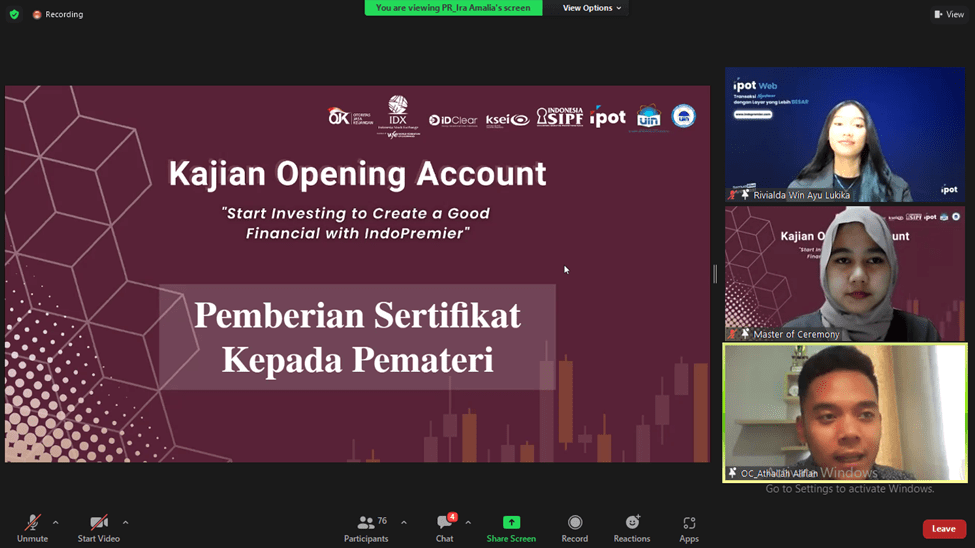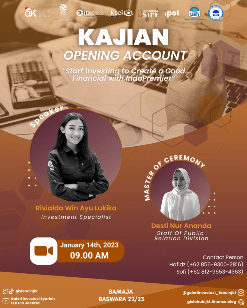 Sabtu, 14 Januari 2023 kemarin, Divisi Public Relation Galeri Investasi Syariah FEB UIN Jakarta telah menyelenggarakan acara Kajian Opening Account dengan tema “Start Investing to Create a Good Financial with IndoPremier.” Kajian Opening Account adalah salah satu agenda dari divisi Public Relation yang di dalamnya membahas tentang serba serbi pembukaan akun di IndoPremier Sekuritas, serta pengenalan lebih jauh mengenai IPOT. Pada Kajian Opening Account ini, pembicaranya berasal dari IndoPremier Sekuritas, yaitu Kak Rivialda Win Ayu Lukika yang merupakan seorang Investment Specialist. Kajian ini dibuka oleh MC, yakni Desti Nur Ananda.