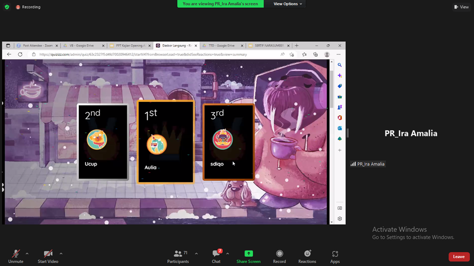 Selanjutnya adalah games Quiziz yang di pandu oleh saudari Ira Amalia Puspitasari.