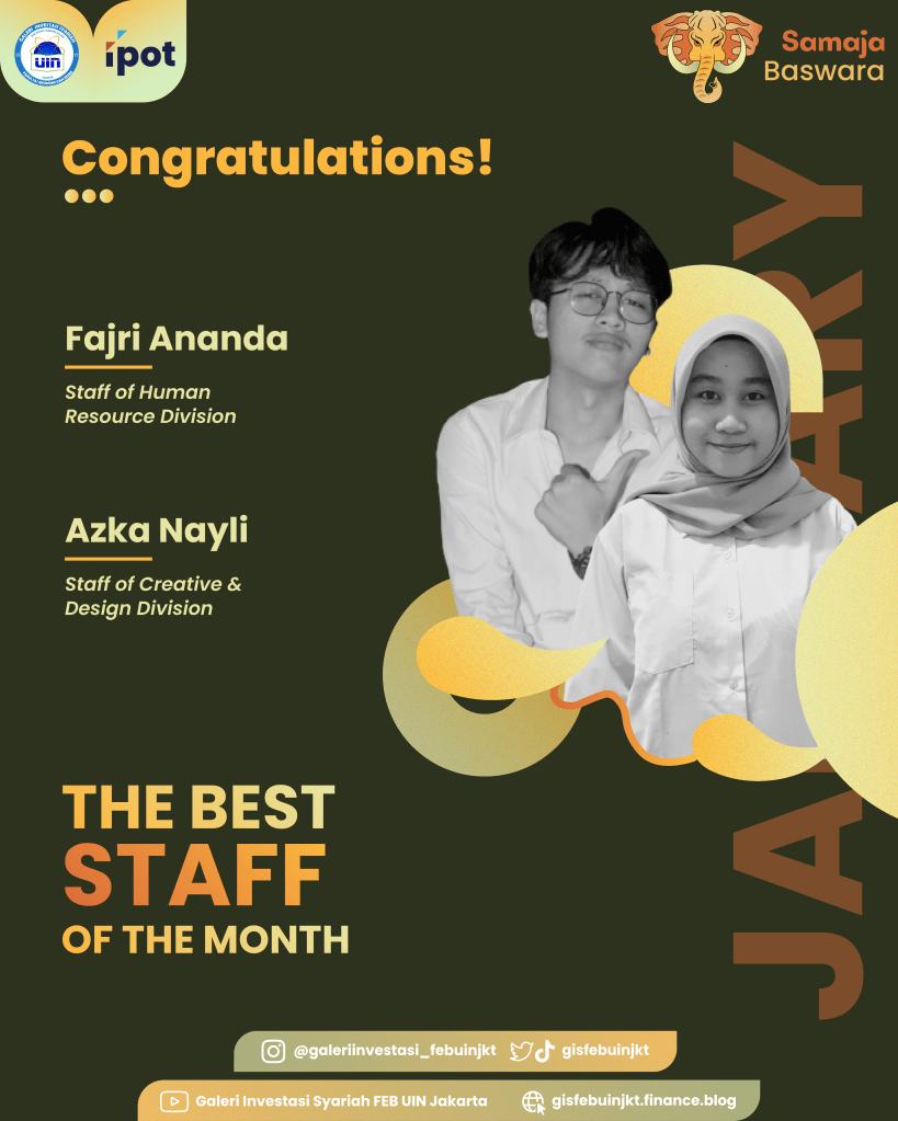Staff of The Month merupakan kegiatan yang dilaksanakan oleh divisi Human Resource GIS FEB UIN Jakarta 2021-2022 Acara ini bertujuan untuk mengapresiasi kepada Anggota GIS atas kinerja dan kontribusi nya dalan satu bulan kepengurusan GIS FEB UIN Jakarta
