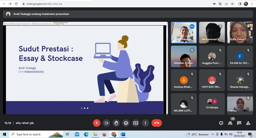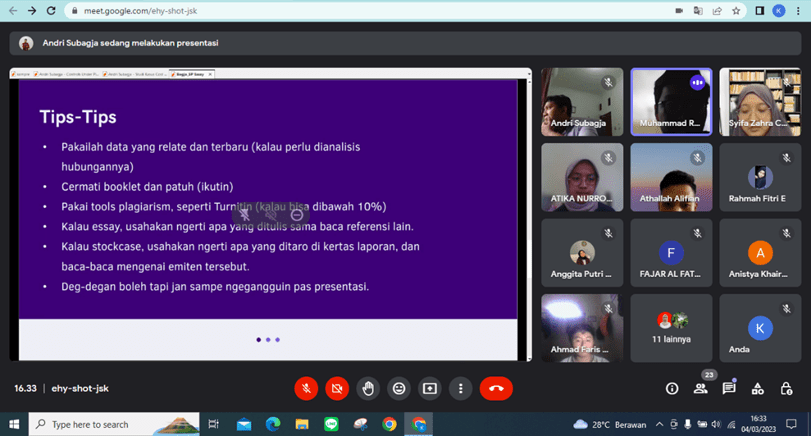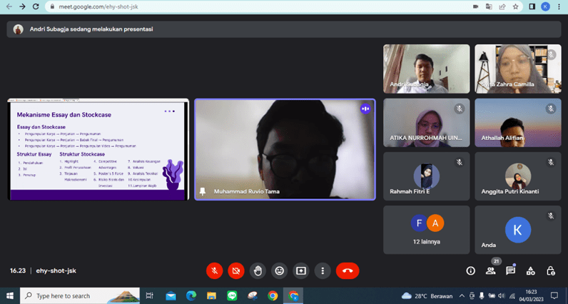 Sabtu, 04 Maret 2023 kemarin, Divisi Human Resource Galeri Investasi Syariah FEB UIN Jakarta telah menyelenggarakan acara “ Mentoring Sudut Prestasi Essay “ yang merupakan bagian dari acara Sudut Prestasi. Pada SP Essay ini di mentori langsung oleh kak Andri Subagja, kak Syifa Zahra, dan kak M. Ruvio Tama.
