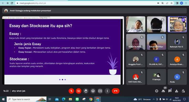 Materi selanjutnya disampaikan oleh kak Syifa Zahra, ia menjelaskan tentang apa itu essay dan stockcase secara umum. Selain itu juga kak Syifa Zahra sharing tentang pengalaman nya pada saat mengikuti lomba essay dan stockcase tersebut.