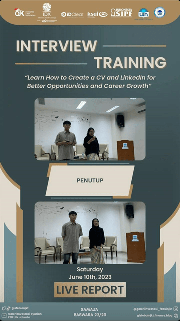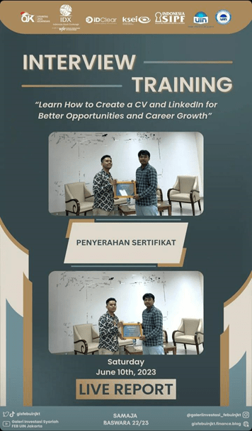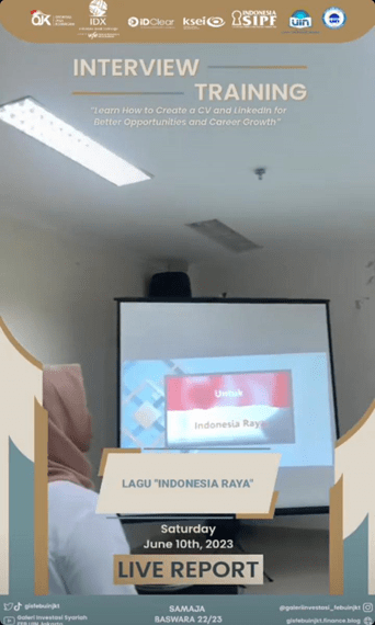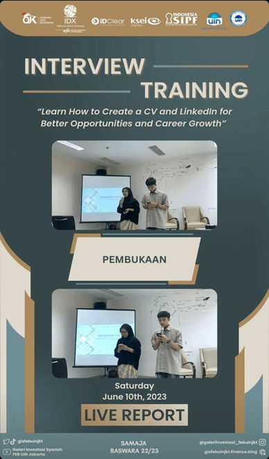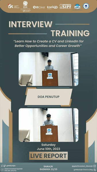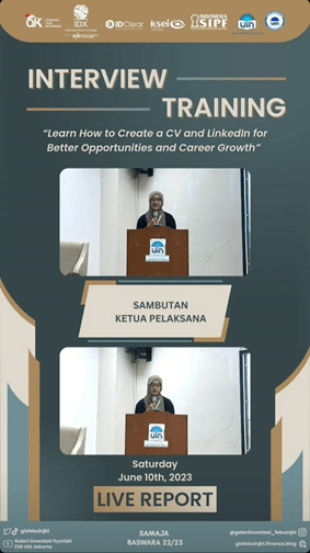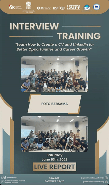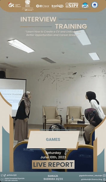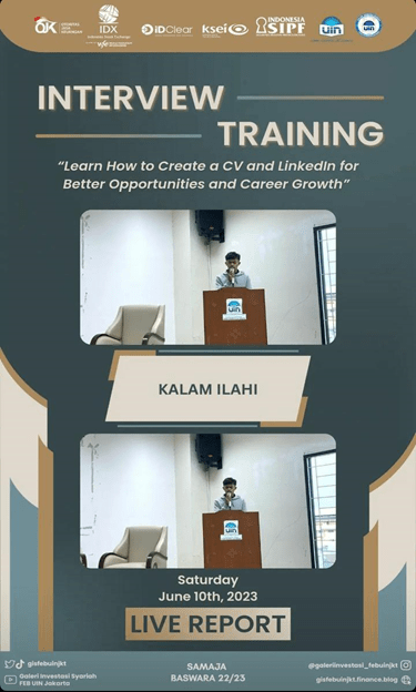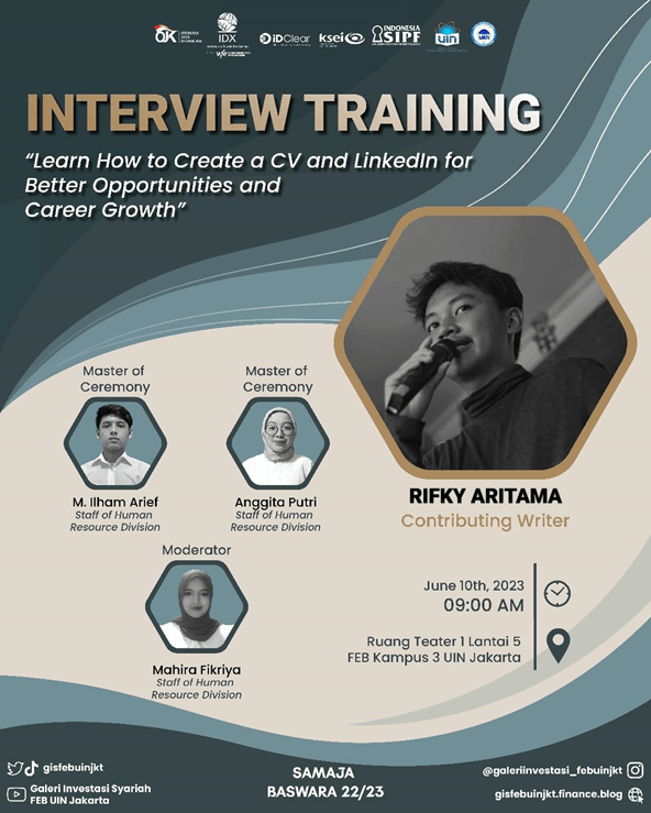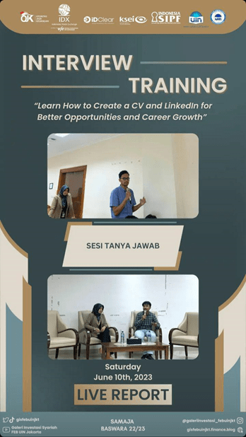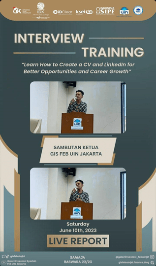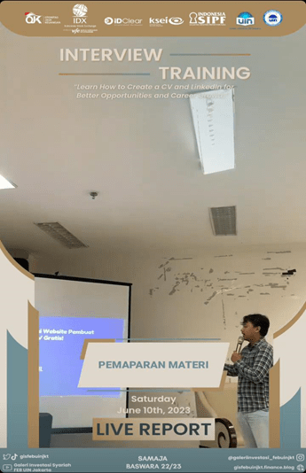 Sabtu, 10 Juni 2023 kemarin, Divisi Human Resource Galeri Investasi Syariah FEB UIN Jakarta telah menyelenggarakan acara Kajian Interview Training dengan tema “Learn How to Create a CV & LinkedIn for Better Opportunities and Career Growth”