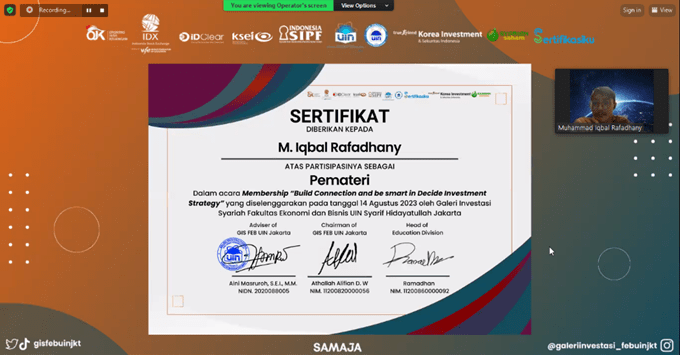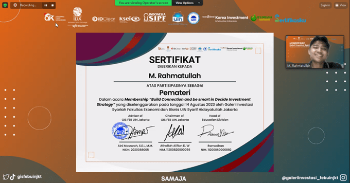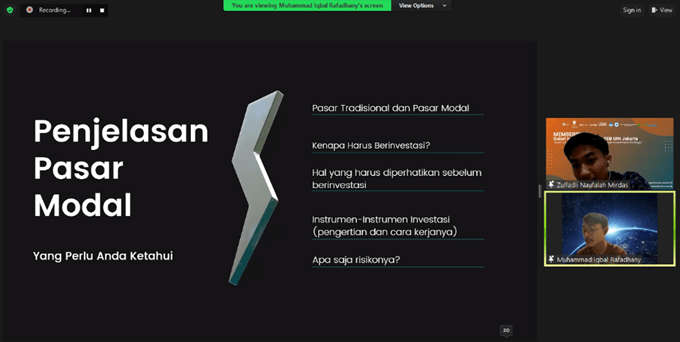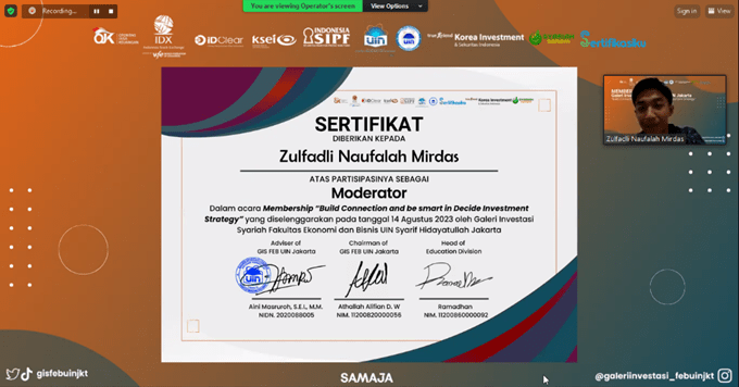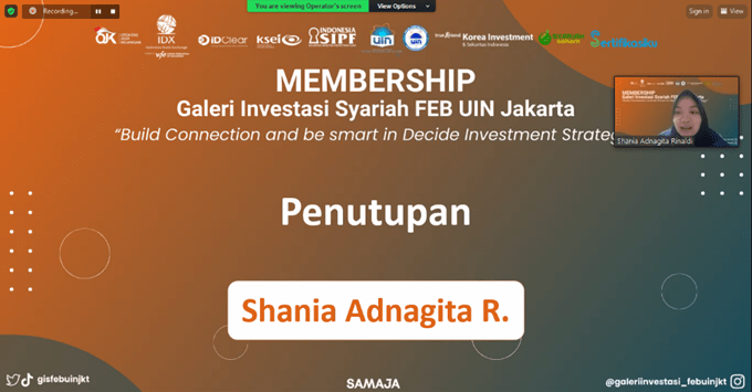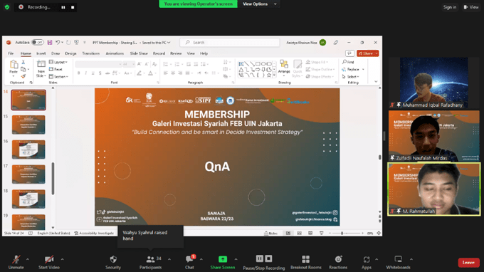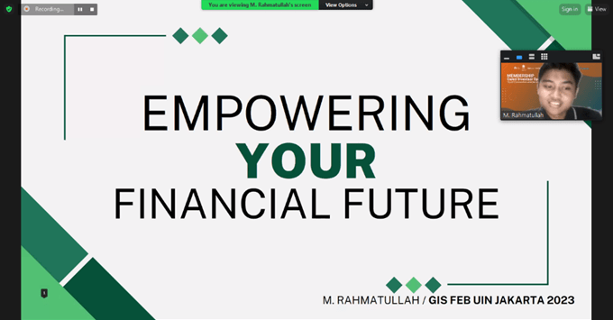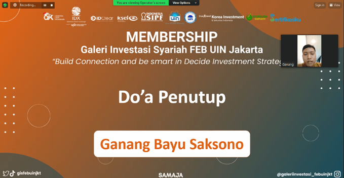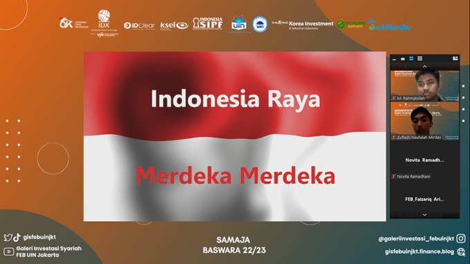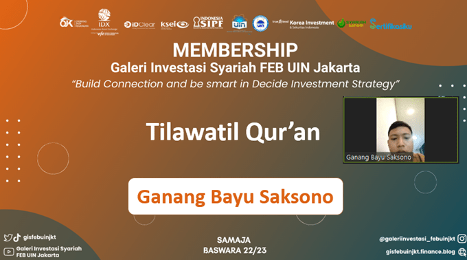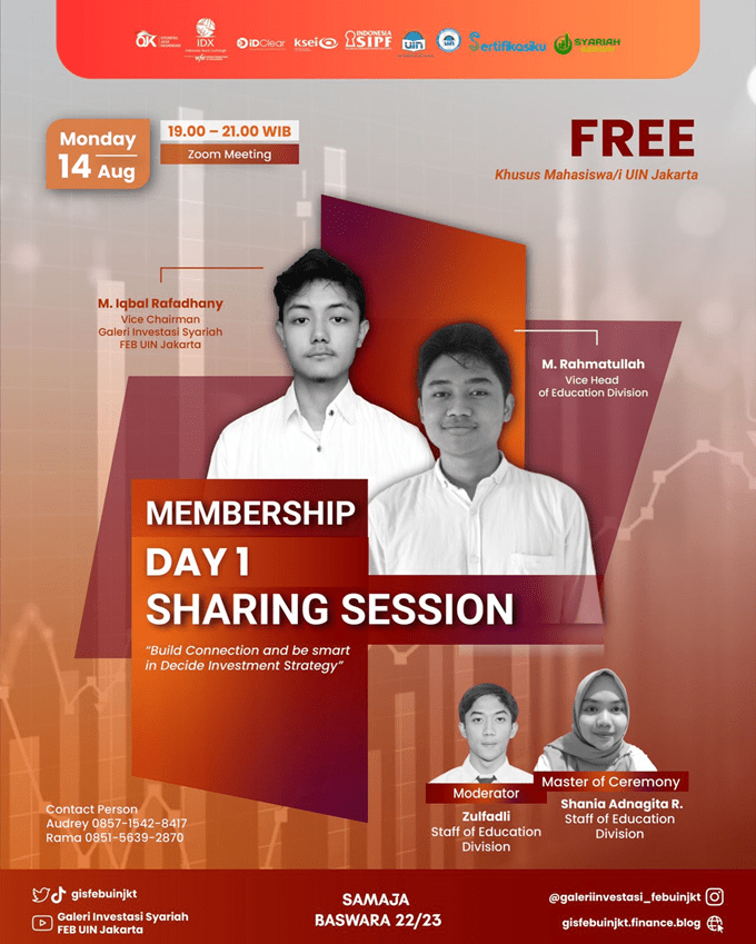 Pada hari Senin, 14 Agustus 2023, Divisi Education Galeri Investasi Syariah FEB UIN Jakarta telah mengadakan Membership Day 1: Sharing Session dengan tema “Build Connection and be Smart in Decide Investment Strategy” yang merupakan bagian dari rangkaian acara Membership 2023. Webinar ini diselenggarakan secara online melalui media virtual meeting zoom. Divisi Education mengundang Saudara M. Iqbal Rafadhany selaku Wakil Ketua Umum Galeri Investasi Syariah FEB UIN Jakarta dan Saudara M. Rahmatullah selaku Wakil Ketua Divisi Education Galeri Investasi Syariah FEB UIN Jakarta.
