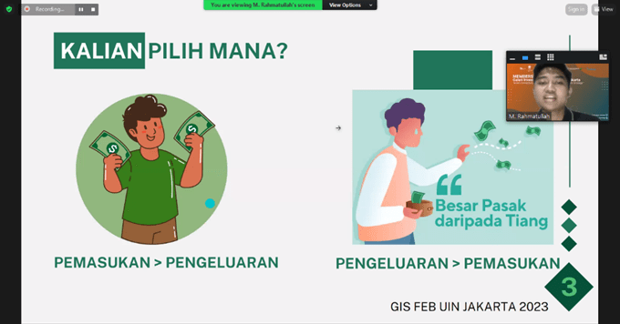 Pada pemaparan materi dimoderatori oleh Zulfadli Naufalah Mirdas. Adapun materi yang dibahas pada acara Sharing Session Membership ini pada materi pertama yaitu tentang Empowering Your Financial Future oleh Saudara M. Rahmatullah. Dalam acara tersebut, ia memaparkan piramida perencanaan keuangan yang melibatkan tahap-tahap penting. Dana darurat dibahas dengan detail, di mana besaran dana darurat ditentukan berdasarkan situasi keuangan masing-masing. Ia juga menyarankan cara mengenali pengeluaran dengan menyimpan bukti, menggunakan aplikasi keuangan, mencatat rutin, serta memisahkan pengeluaran. Saudara M. Rahmatullah juga menyoroti pentingnya memahami anggaran yang realistis dengan prinsip alokasi 50% untuk kebutuhan dasar, 30% untuk kenikmatan hidup, dan 20% untuk merencanakan masa depan finansial. Proporsi ini dapat disesuaikan dengan kebutuhan dan tujuan pribadi masing-masing. Dalam konteks investasi untuk pemula, ia menyebutkan instrumen seperti reksadana, sukuk, obligasi, dan saham sebagai pilihan yang dapat dijelajahi.