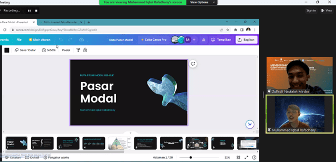 Selanjutnya, materi yang dibahas pada acara Sharing Session Membership pada materi kedua yaitu tentang Pasar Modal yang disampaikan oleh Saudara M. Iqbal Rafadhany. Dalam kesempatan tersebut, beliau memaparkan alasan mendalam mengapa investasi menjadi suatu keharusan, dengan berfokus pada sejumlah faktor penting. Hal ini mencakup kemampuan investasi untuk mengatasi inflasi, mencapai tujuan finansial, mendukung perkembangan ekonomi negara, melindungi dan menambah nilai aset, serta melatih keterampilan pengelolaan keuangan dan kedisiplinan. Tidak hanya itu, ia juga menawarkan panduan yang bermanfaat sebelum memulai investasi, seperti pentingnya memahami bahwa pasar modal bukan cara cepat untuk mencapai kekayaan, mendalami prinsip dasar investasi, mengecek keabsahan legalitas, merencanakan keuangan secara cermat, menganalisis instrumen investasi secara teliti, dan mengidentifikasi profil risiko yang sesuai (konservatif, moderat, atau agresif).