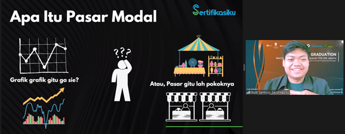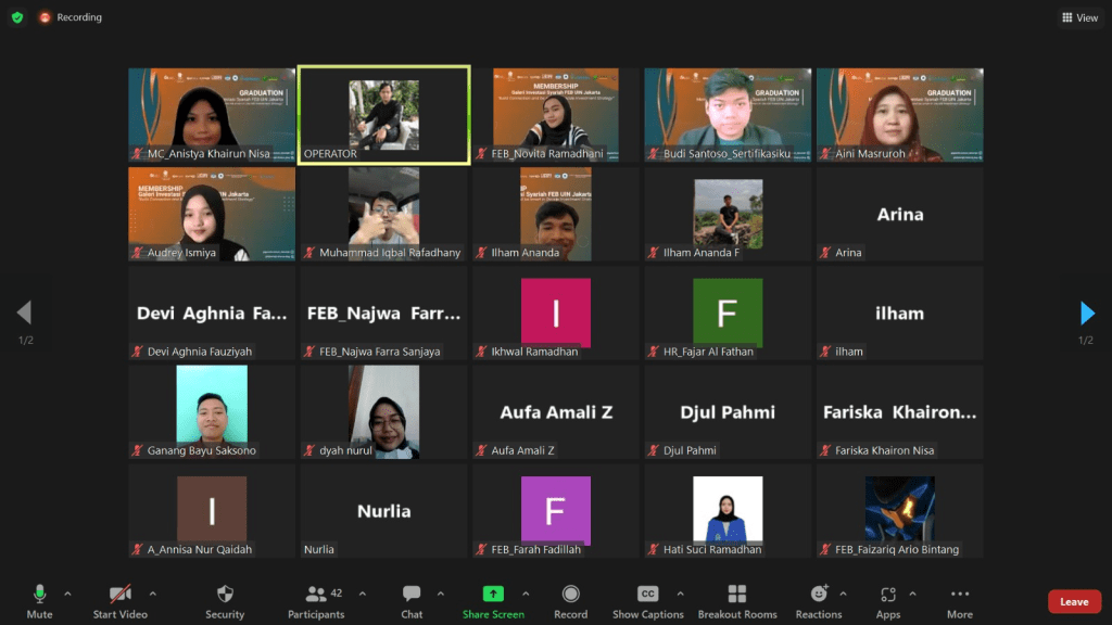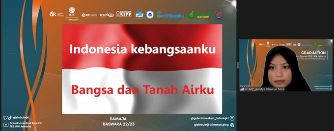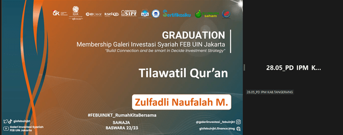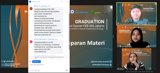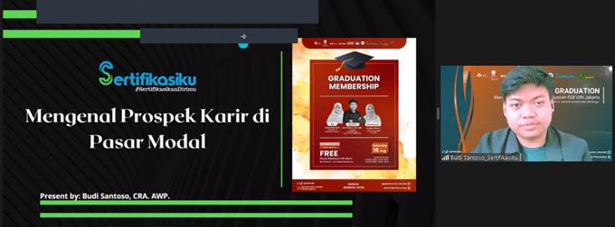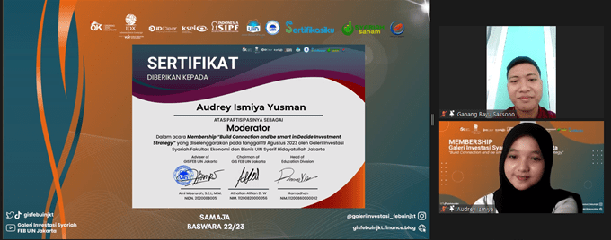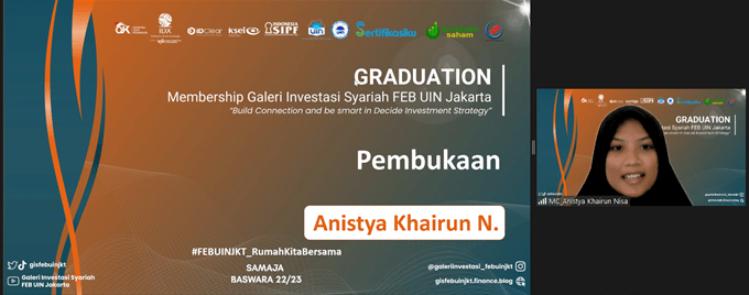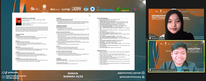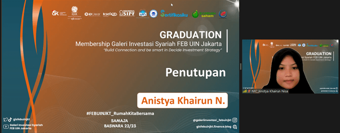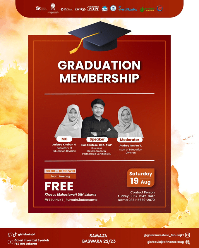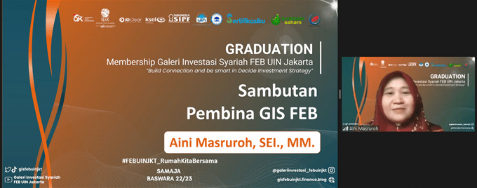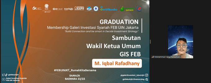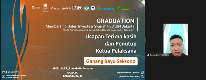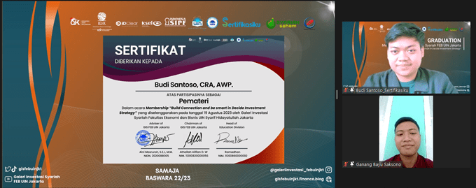 Pada hari Sabtu, 19 Agustus 2023, Divisi Education Galeri Investasi Syariah Fakultas Ekonomi dan Bisnis (FEB) Universitas Islam Negeri (UIN) Syarif Hidayatullah Jakarta dengan bangga telah mengadakan acara Graduation Membership sebagai penutup rangkaian acara Membership 2023. Acara ini mengusung tema “Build Connection and be Smart in Decide Investment Strategy” dan diselenggarakan secara online melalui media virtual meeting zoom. Divisi Education mengundang Kak Budi Santoso, CRA., AWP., selaku Business Development & Partnership Setifikasiku sekaligus pemateri pada acara kali ini.