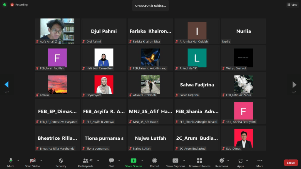 Pada pemaparan materi dimoderatori oleh Audrey Ismiya Yusman. Adapun materi yang dibahas pada acara ini yaitu tentang Mengenal Prospek Karir di Pasar Modal oleh Kak Budi Santoso, CRA., AWP. Dalam kesempatan tersebut, narasumber membahas prospek karir di pasar modal, menggarisbawahi beberapa kualifikasi dan keterampilan kunci yang dibutuhkan. Para calon profesional di bidang ini perlu memiliki latar belakang pendidikan yang relevan, seperti keuangan, ekonomi, atau hukum. Kemampuan analitis dan pemahaman yang kuat tentang data keuangan sangat penting, bersama dengan kemampuan berkomunikasi yang baik untuk berinteraksi dengan klien, regulator, dan rekan kerja. Pengetahuan tentang peraturan pasar modal dan regulasi terkait juga menjadi keharusan. Pelatihan dan sertifikasi yang sesuai dapat meningkatkan peluang karir, sementara jaringan dan hubungan dalam industri ini juga memiliki peran penting.
