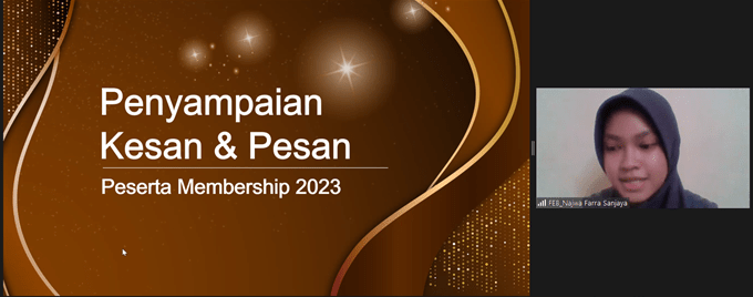Selesai melakukan penyerahan sertifikat, acara dilanjutkan dengan ucapan terima kasih dan penutup oleh Ketua Pelaksana Membership 2023, Saudara Ganang Bayu Saksono. Setelah itu, pengumuman kategori peserta terbaik Membership 2023 dan kategori lainnya. Dilanjutkan dengan penyampaian kesan dan pesan oleh peserta terbaik Membership 2023 sebagai perwakilan peserta Membership 2023.