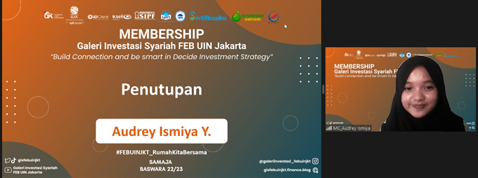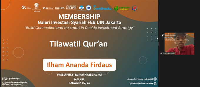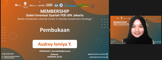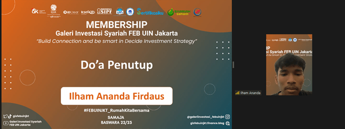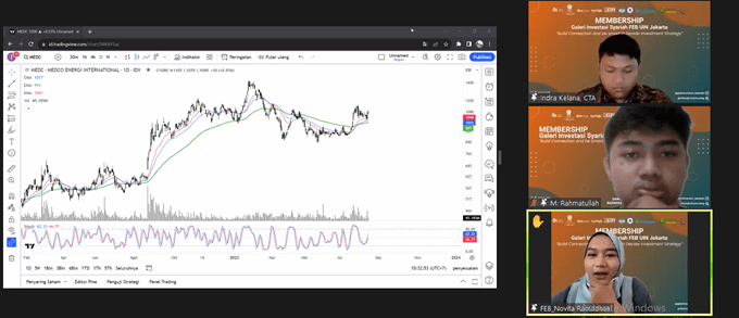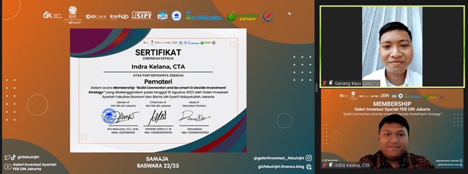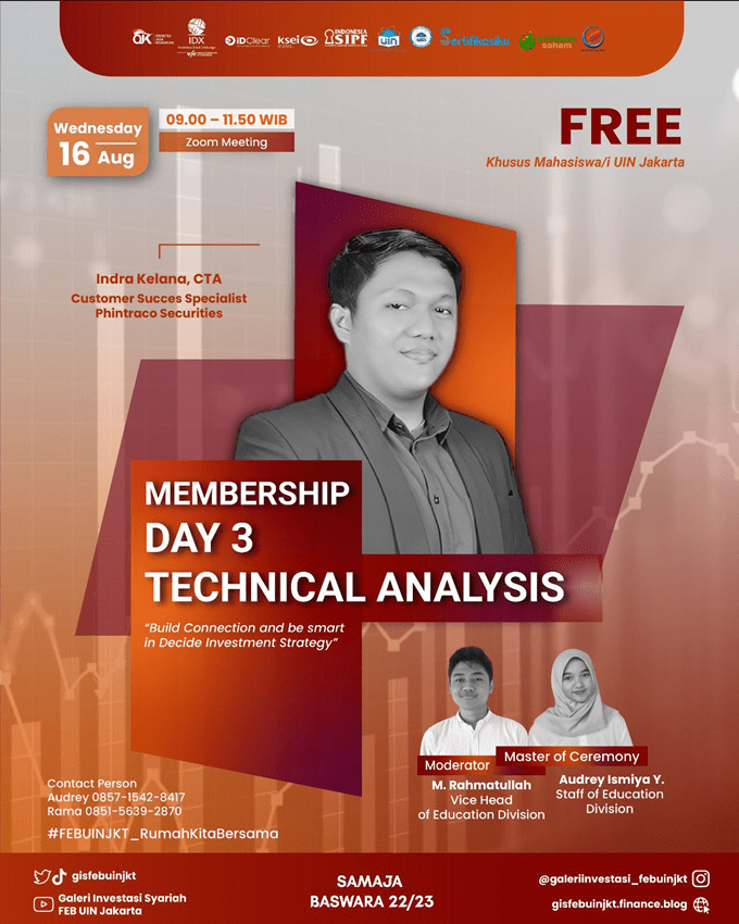 Pada hari Rabu, 16 Agustus 2023, Divisi Education Galeri Investasi Syariah FEB UIN Jakarta telah sukses menyelenggarakan Membership Day 3: Technical Analysis dengan tema “Build Connection and be Smart in Decide Investment Strategy” yang merupakan bagian dari rangkaian acara Membership 2023. Webinar ini diselenggarakan secara online melalui media virtual meeting zoom. Divisi Education mengundang Kak Indra Kelana, CTA., selaku Customer Success Specialist PT Phintraco Sekuritas sekaligus pemateri pada acara kali ini.