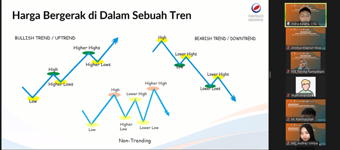 Pada pemaparan materi dimoderatori oleh M. Rahmatullah. Adapun materi yang dibahas pada acara ini yaitu tentang Technical Analysis oleh Kak Indra Kelana, CTA. Dalam kesempatan tersebut, beliau menjelaskan bahwa Analisis Teknikal adalah metode dalam perdagangan dan investasi yang melibatkan penggunaan data historis harga serta volume suatu aset, guna memprediksi pergerakan harga di masa depan. Metode ini melibatkan penggunaan grafik, indikator teknikal, dan pola harga historis untuk mengidentifikasi tren, level support dan resistance, serta momen masuk dan keluar yang potensial. Tujuan utama dari analisis ini adalah untuk mengambil keputusan perdagangan berdasarkan analisis statistik dan grafis yang mencerminkan psikologi pasar.