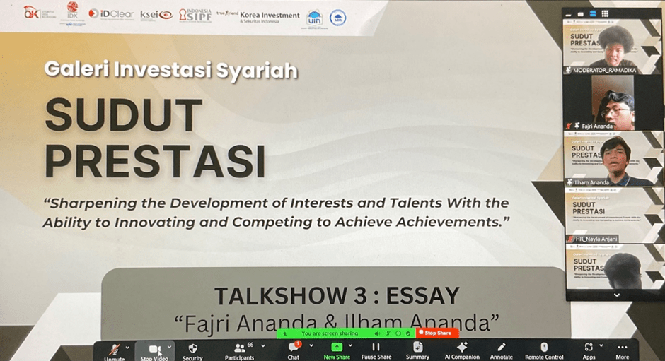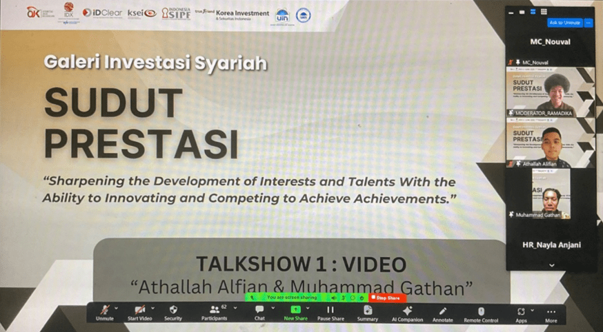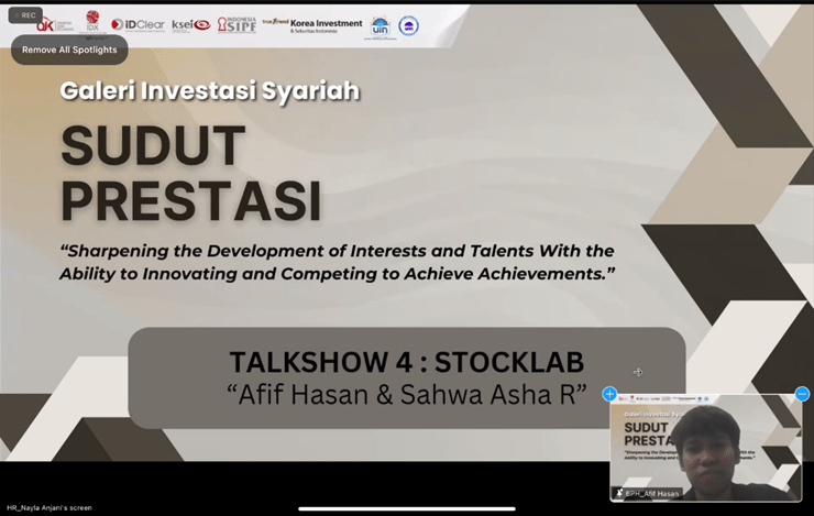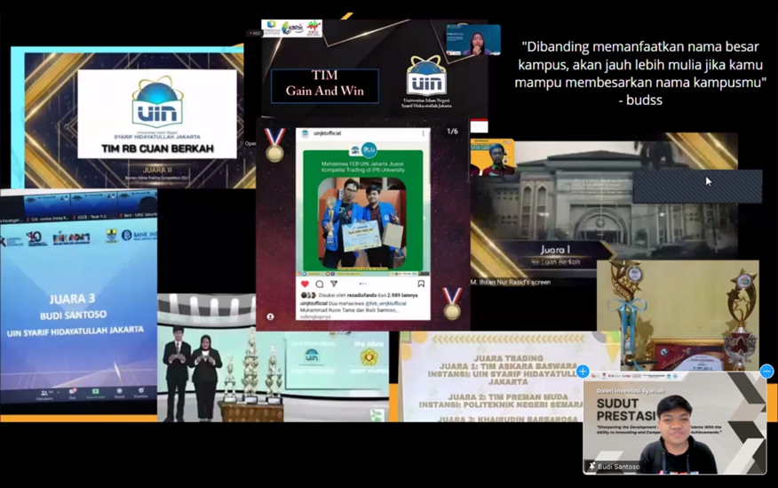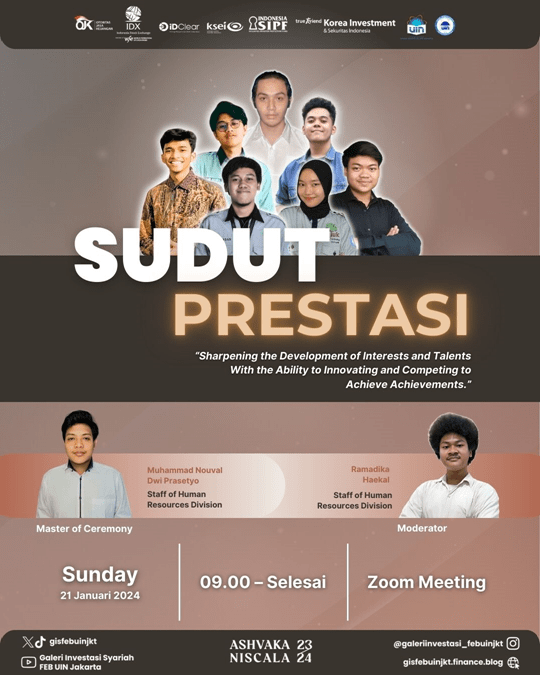 Minggu, 21 Januari 2024, Divisi Human Resource Galeri Investasi Syariah FEB UIN Jakarta telah menyelenggarakan acara Opening Sudut Prestasi dengan tema “Sharpening the Development of Interest and Talents with the Ability to Innovating and Competing to Achieve Achievement.”