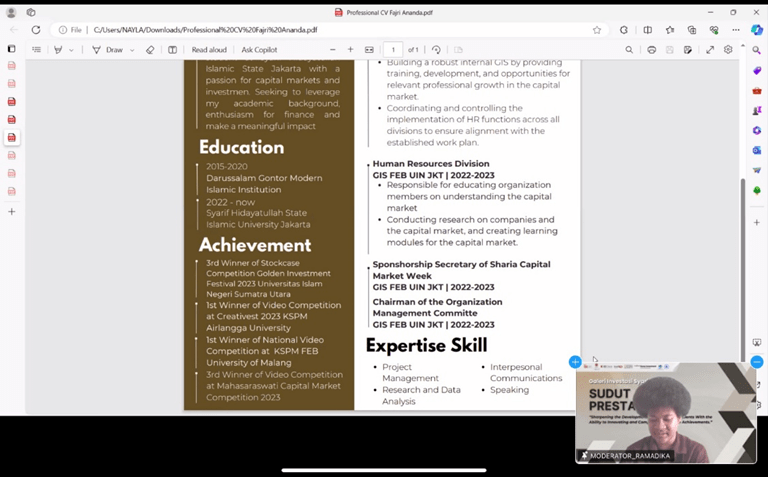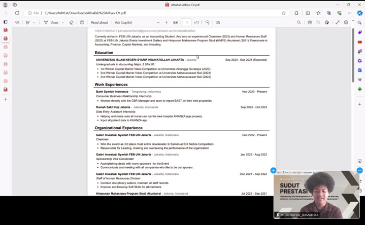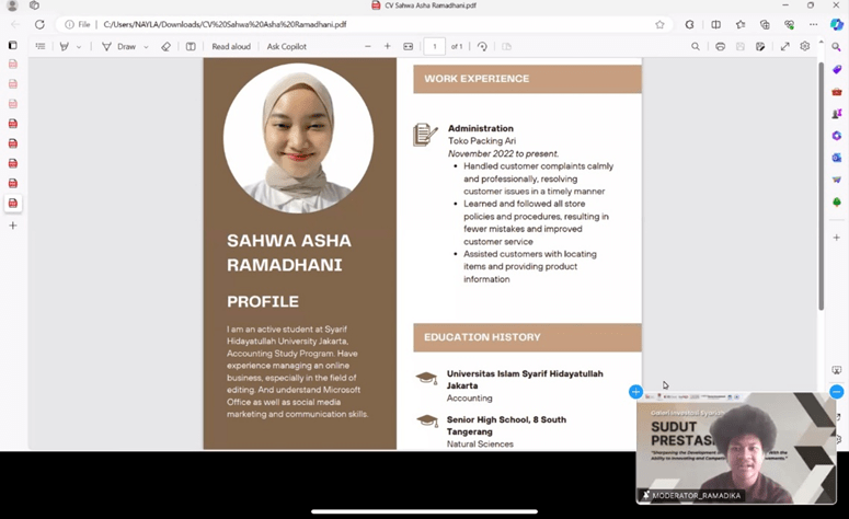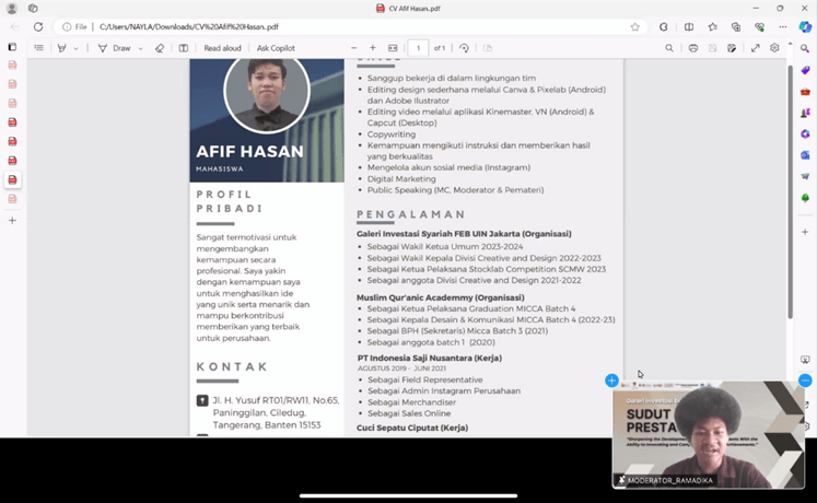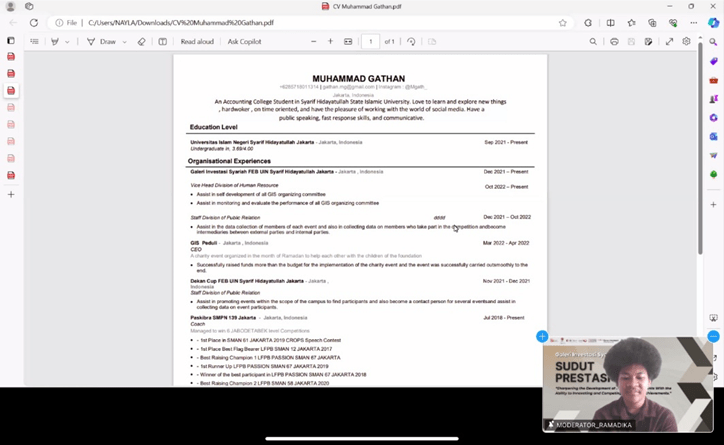 Selanjutnya yaitu pembacaan CV Moderator yakni Ramadika Haekal, yang akan dibacakan oleh MC yakni