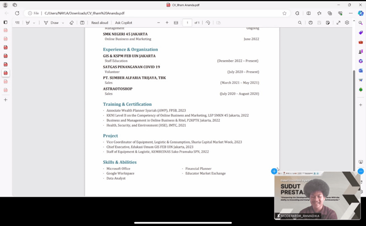 Selanjutnya, sebelum memulai pembahasan materi yang kedua, Ramadika selaku moderator membacakan CV dari mentor SP Trading yakni kak Budi Santoso, CRA. AWP.