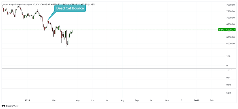 IHSG pernah mengalami dead cat bounce pada bulan febrari yang naik dari harga 6500 ke harga 6800 setelah penurunan tajam dari harga 7200 ke harga 6500. Akan tetapi bisa dilihat jika dari gambar tersebut menunjukkan bahwa kenaikan tersebut hanyalah sementara, yang pada akhirnya itu hanyalah tipuan belaka. Setelah naik ke harga 6800, pergerakan harga saham gabungan atau IHSG mengalami trend penurunan kembali hingga menyentuh batas 6100. Hal ini lah yang harus kalian hindari